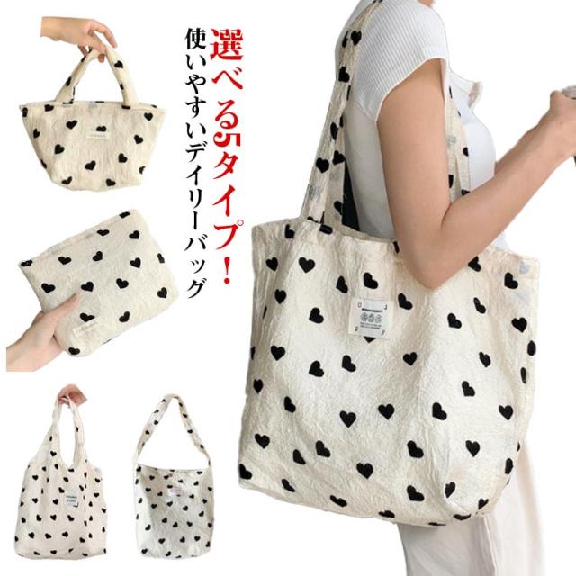| 選べる5タイプ!使いやすいデイリーバッグ 今年トレンドの大人気のハート柄デザイン! ガーリーなハート柄もモノトーンなら大人っぽく持てて◎ 荷物もたくさん入るので、通勤・通学時の サブバッグとしても、コーデのアクセントにも◎ | |