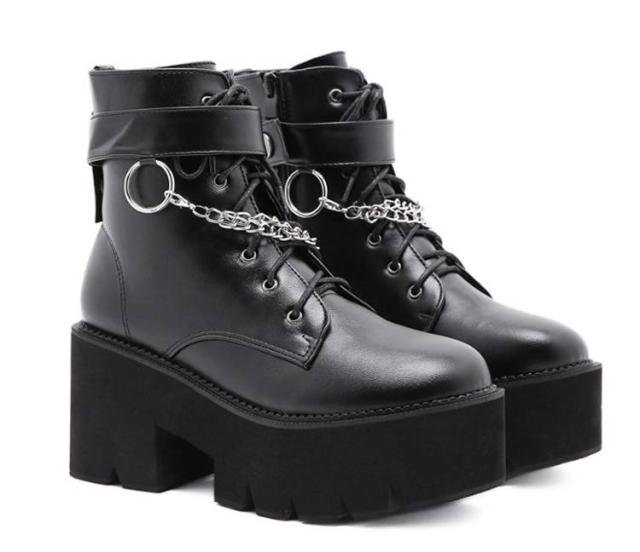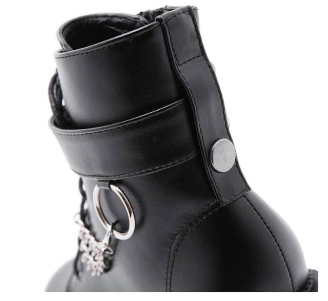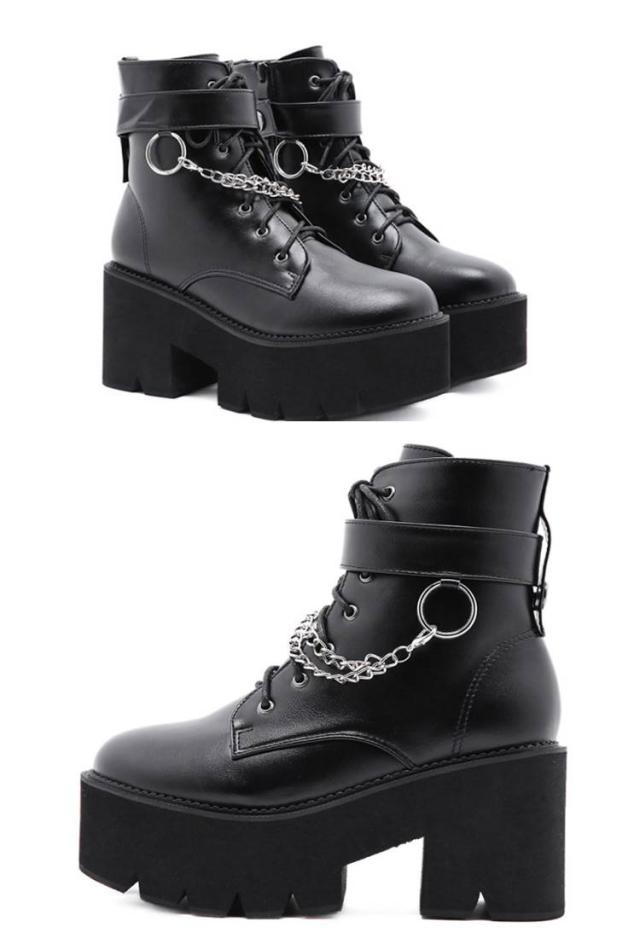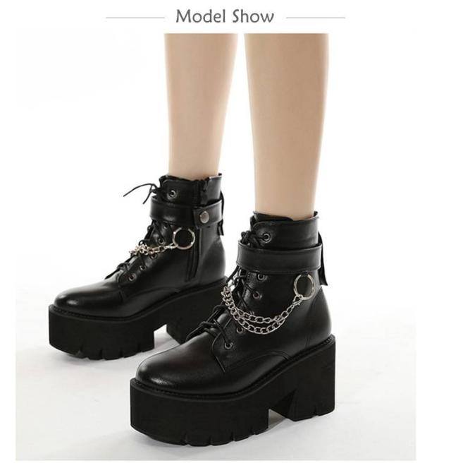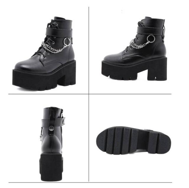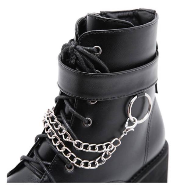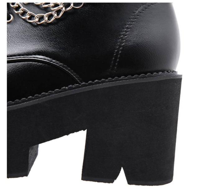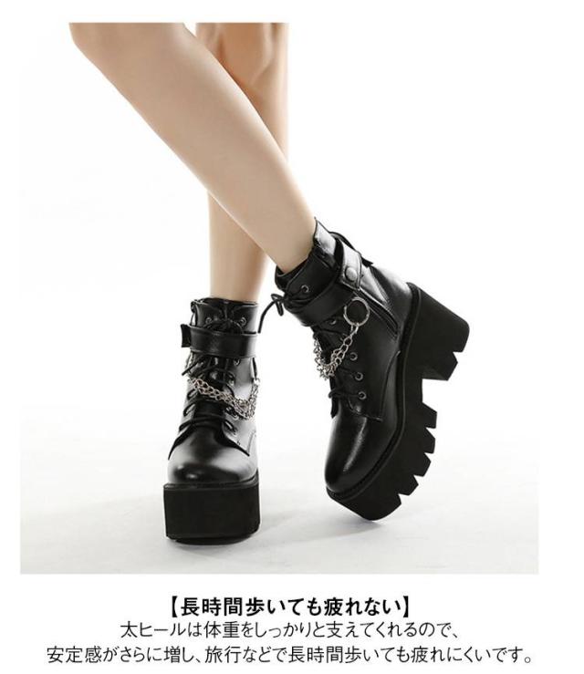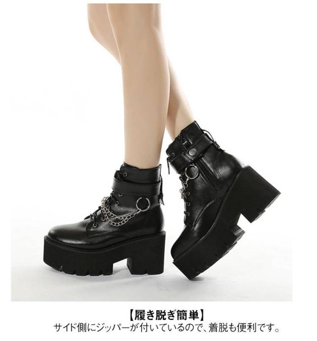 厚底靴 厚底ブーツ ヒールブーツ レディース ショートブーツ 黒 厚底靴 チャンキーヒール ヒール8cm ハイヒール Uレザー Pチェーン付き 前厚 ブーツ 秋冬 厚底 美脚 モード系 ゴスロリ ロリータ キャバ