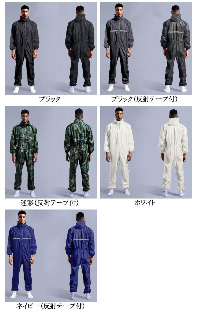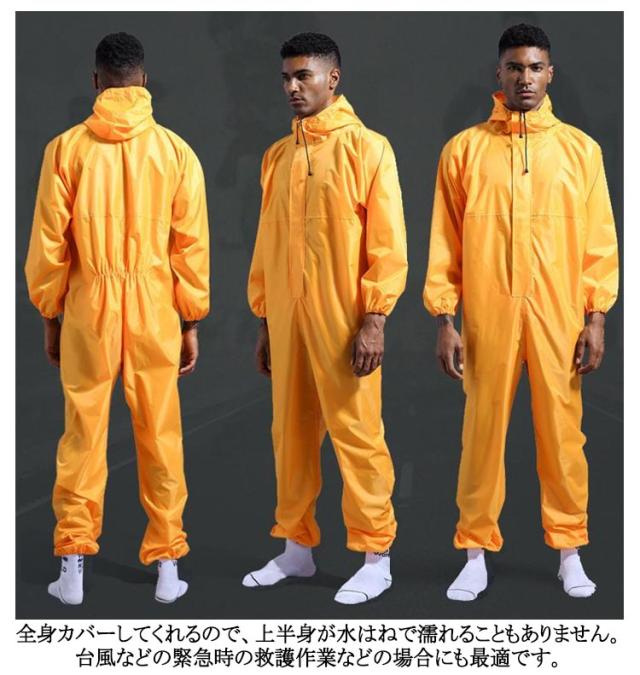 | 防水性と軽さ、素材感にこだわったつなぎタイプレインコート。つなぎのように全身を覆うタイプのメンズ用レインコートです。防水つなぎレインコートです。 フード付きで全身をすっぽり覆ってくれる防水着です。 雨天作業におすすめのつなぎのレインウェア 。 全身カバーしてくれるので、上半身が水はねで濡れることもありません。 台風などの緊急時の救護作業などの場合にも最適です。 ダブルジッパータイプで着脱簡単です。 フードにはストラップ付ですので、水の侵入をしっかり防ぎます。 伸縮性のある袖口デザインです。 無地と反射テープ付きの2タイプからお選び頂けます。 蛍光テープ付きは車などからの視認性も高まり、安心安全にご利用いただけます。 ワーク スポーツ アウトドアなど様々なシーンで活躍する防水つなぎ | |