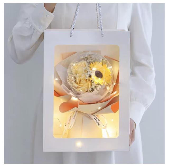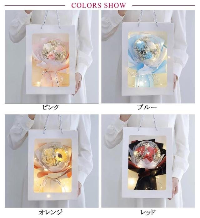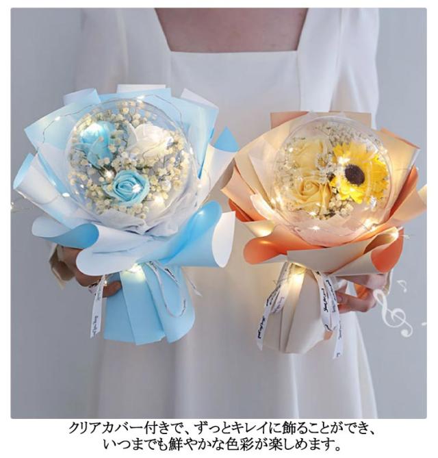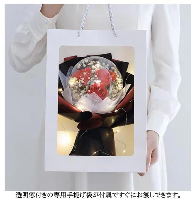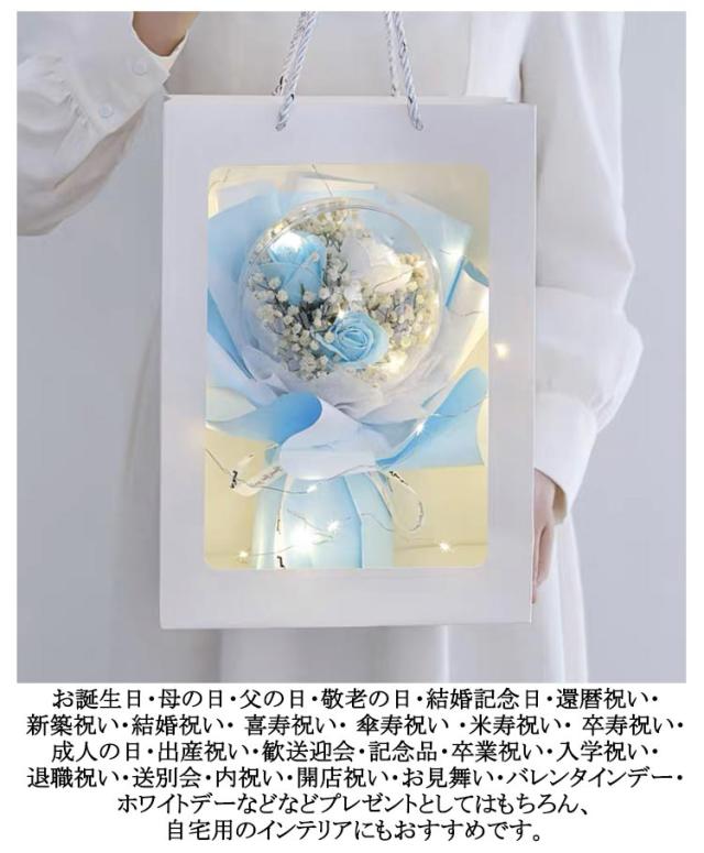 | 可愛いアクリルバルーン入りローズブーケ。 透明なバルーンケースは、穴があり、ほんのりソープの香りが楽しむことができるながら、ほこりや汚れからお花を守ってくれます。 生花と違い花粉もないので花粉アレルギーの人へのプレゼントや病院へお見舞いの品としても安心して贈ることができます。 クリアカバー付きで、ずっとキレイに飾ることができ、いつまでも鮮やかな色彩が楽しめます。 水やり・お手入れ不要なので忙しい中、手を煩わせることなく、届いてすぐ飾れる、枯れないお花、見ているだけで心が和みます。 お誕生日・母の日・父の日・敬老の日・結婚記念日・還暦祝い・新築祝い・結婚祝い・ 喜寿祝い・ 傘寿祝い ・米寿祝い・ 卒寿祝い・成人の日・出産祝い・歓送迎会・記念品・卒業祝い・入学祝い・退職祝い・送別会・内祝い・開店祝い・お見舞い・バレンタインデー・ホワイトデーなどなどプレゼントとしてはもちろん、自宅用のインテリアにもおすすめです。 透明窓付きの専用手提げ袋が付属ですぐにお渡しできます。 | |
