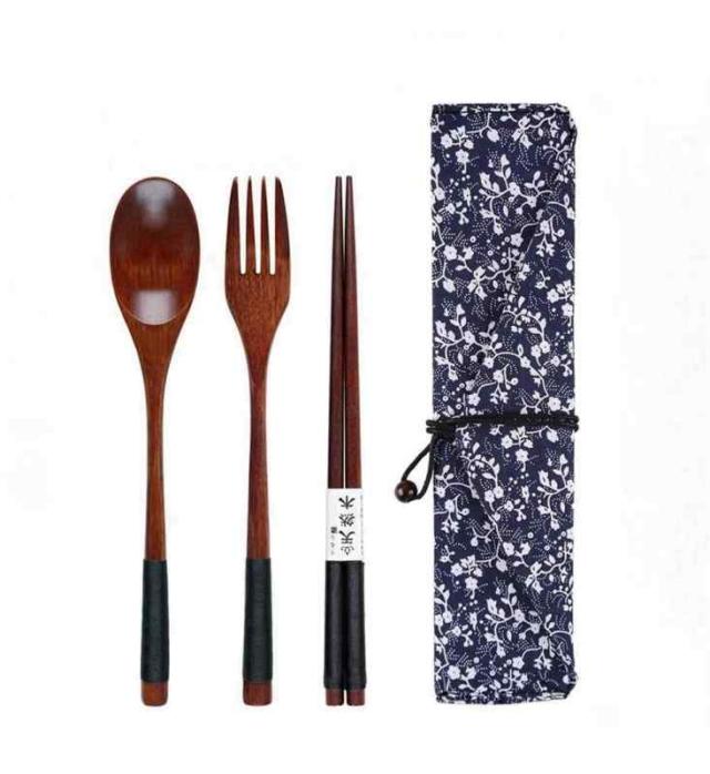 【食器セット内容】木製カトラリー4点セット(箸袋+箸+スプーン+フォーク)軽量の布製ポーチは3つの木製旅行用具をまとめて持ち運びが簡単です。 この旅行道具セットは、外出先での使用に最適です。