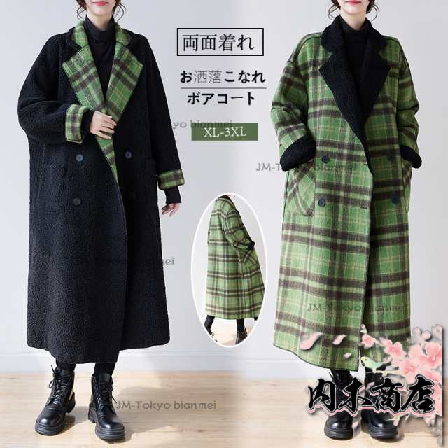 両面着れる 裏ボアコート レディース アウター 冬用 チェスターコート 裏ボア 大きいサイズ チェック柄 ロングコート 防寒 ボアコート