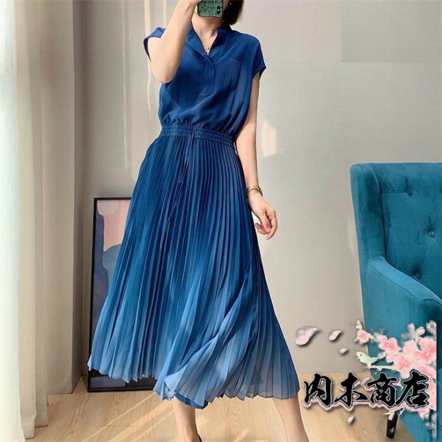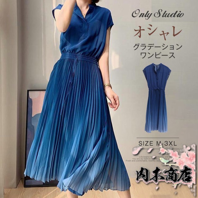 プリーツワンピース ワンピース 春 夏 夏服 ロングワンピース プリーツ ワンピ レディース 半袖 ドレス 大きいサイズ きれいめ 上品 オフィス 通勤 結婚式 送料無料 20代 30代 40代 50代 グラデーション ミモレ丈 ウエストゴム