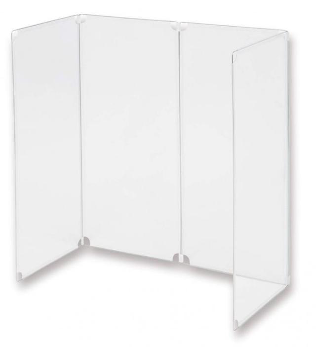 0.4mm厚の透明ペット素材のパネルを4枚連結した商品でコの字型に設置可能です。1枚パネルのサイズはw285×h605mmで高さが十分にあり安心です。