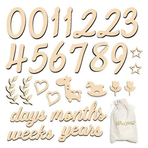 【セット内容】合計29枚セット、0*2枚、1*2枚、2*2枚、3~9各1枚、キリン*1枚、花*2枚、星*2枚、ハート*2枚、馬*1枚、days、weeks、months、years各一枚、合計27枚、サイズ:写真欄にご参照ください。素材:ウッド、厚さ:約3.6mm