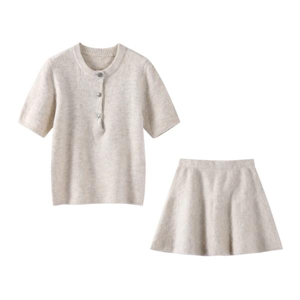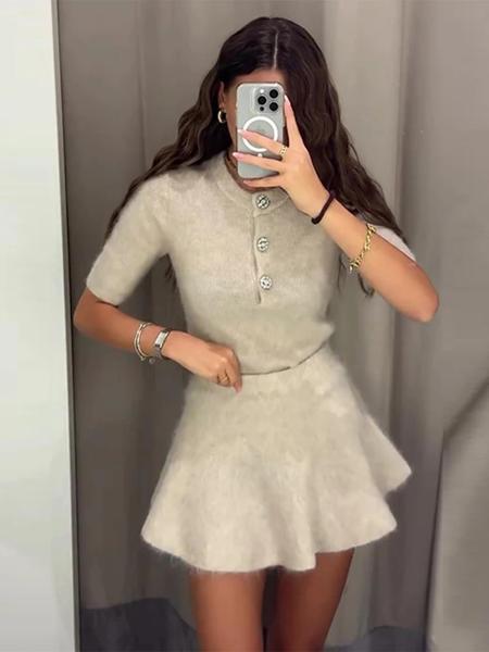 女性用ニットミニスカートセット,シングルブレスト,半袖セーター,カジュアルスーツ,エレガントなモノクロ衣装,秋,2021