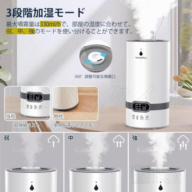 【5L大容量&リモコン機能付き】Nobelbird加湿器は5.0L大容量で頻〓に給水する必要はありません。 最大42時間(弱モード)の運転が可能で、夜明け前も安心して過ごせます。 3つのミストモードで最大加湿量は300ml/hです。広いお部屋にもしっかりと潤いを与えてくれます。 便利な2WAYの上部給水タイプなので、そのまま上から給水、またはタンクを取り出して給水することも可能です。空焚き防止機能も付いており、水が足りないと自動的に作動停止します。リモコン機能もあり、離れた場所や床置き設置でもリモコンだけで簡単に操作できます。
