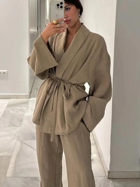 TRAF-女性用長袖ブラウスとワイドレッグパンツ,カーキ色のモノキスーツ,巾着ストリートウェア,伸縮性ウエスト,ファッション,2024