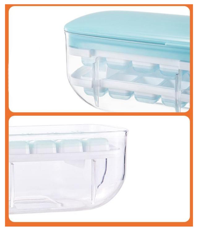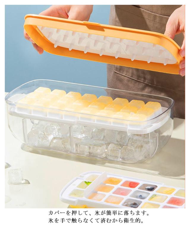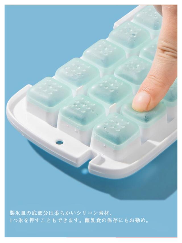 | 蓋を閉めて押すだけ簡単に氷を取り出せる♪ カバーを押して、氷が簡単に落ちます。氷を手で触らなくて済むから衛生的。 製氷皿の底部分は柔らかいシリコン素材、1つ氷を押すこともできます。離乳食の保存にもお勧め。 製氷皿は取っ手付きで取り出しやすく、使い勝手抜群。2段の大容量なので、一回で大量に作れます。 氷の製造と貯蔵はこれ1つで済むからとても便利です。 | |