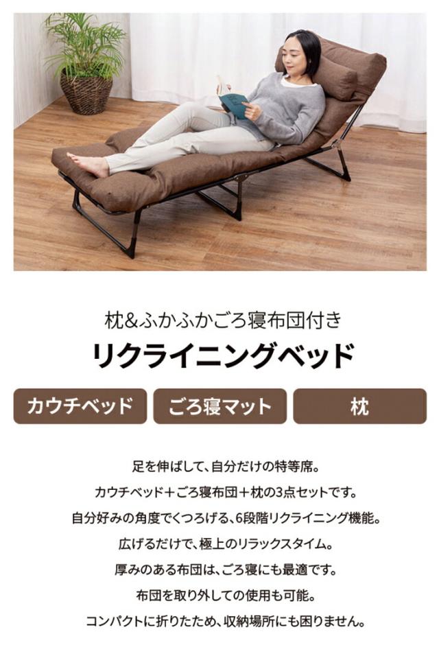 コンパクト リクライニングベッド ごろ寝ベッド カウチベッド 折りたたみベッド リクライニングチェア ごろ寝マット 折りたたみマットレス 簡易ベッド 昼寝ベッド 一人用ベッド コンパクトベッド 枕付き リクライニング機能付き リラックスベッド 送料無料