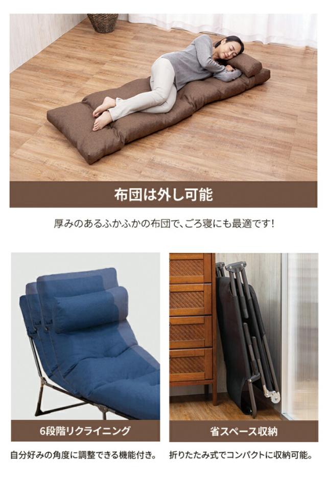 カウチベッド+ごろ寝マット+枕の3点セットです。自分好みの角度でくつろげる、6段階リクライニング機能。広げるだけで、極上のリラックスタイム。厚みのある布団は、ごろ寝にも最適です。布団を取り外しての使用も可能。コンパクトに折りたため、収納場所にも困りません。