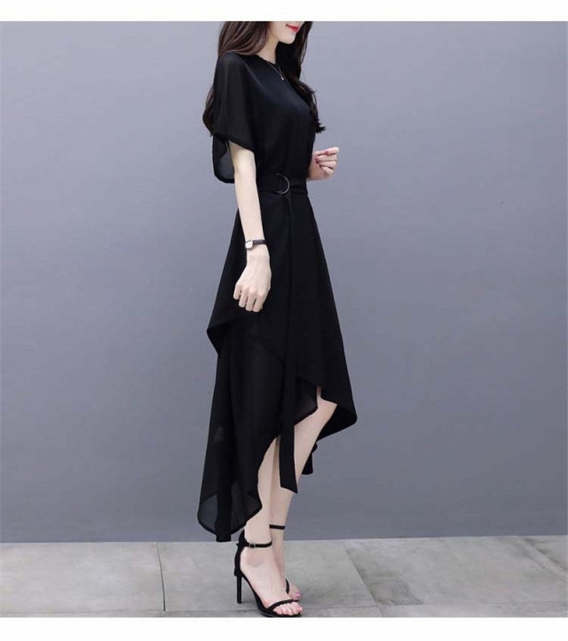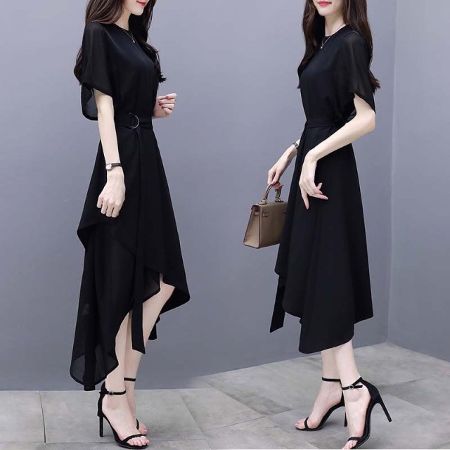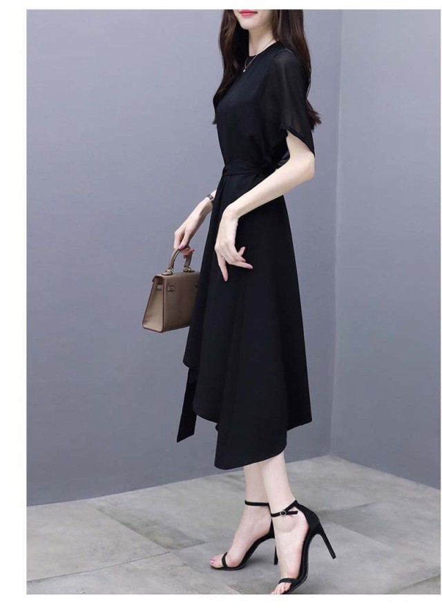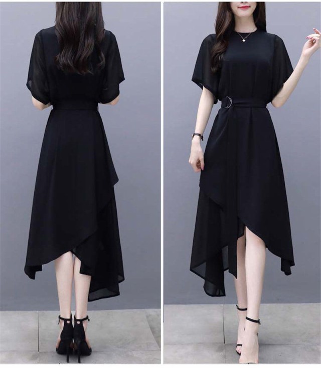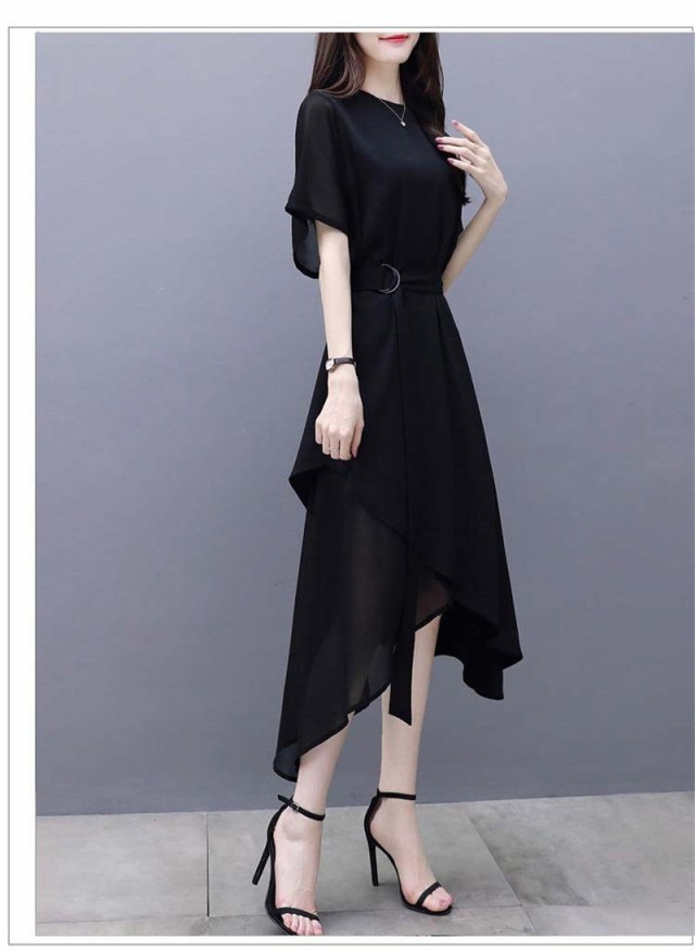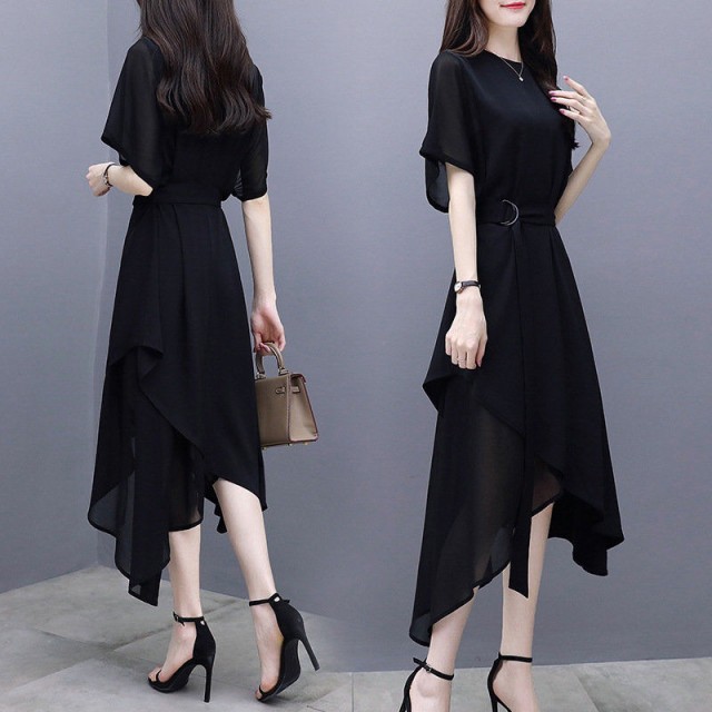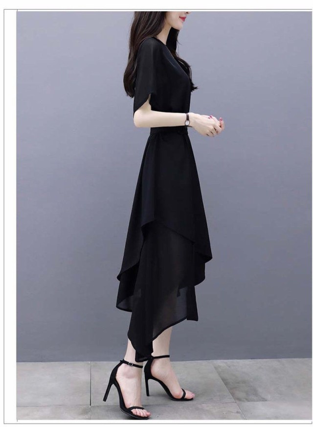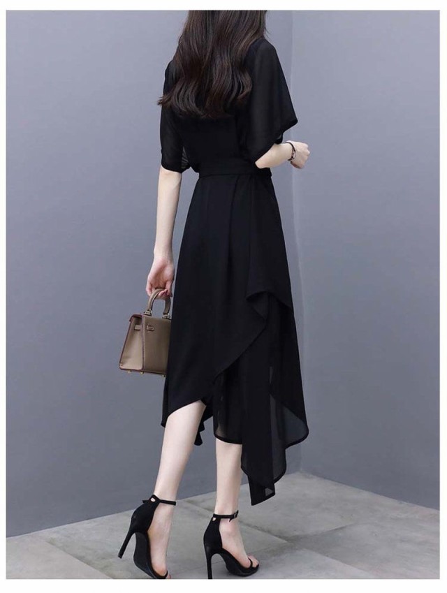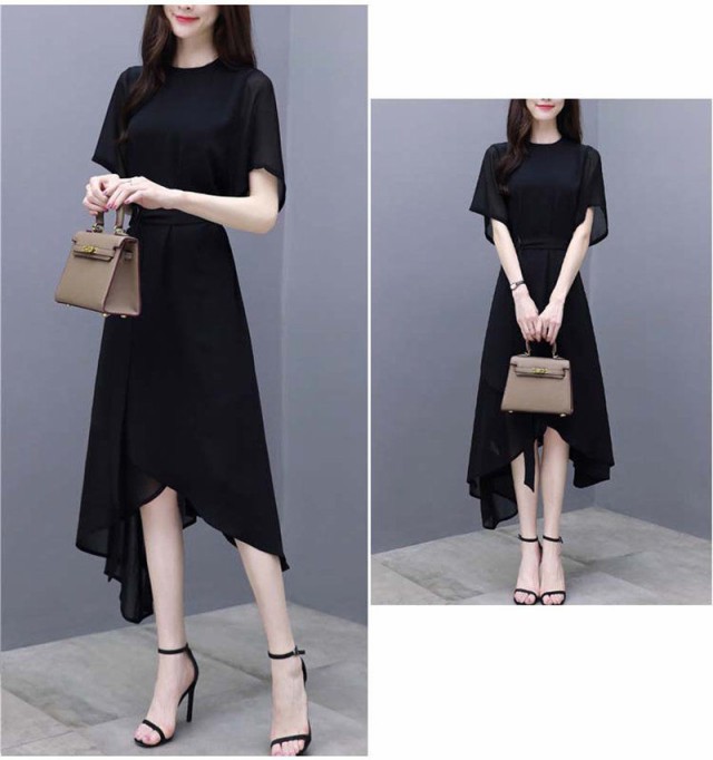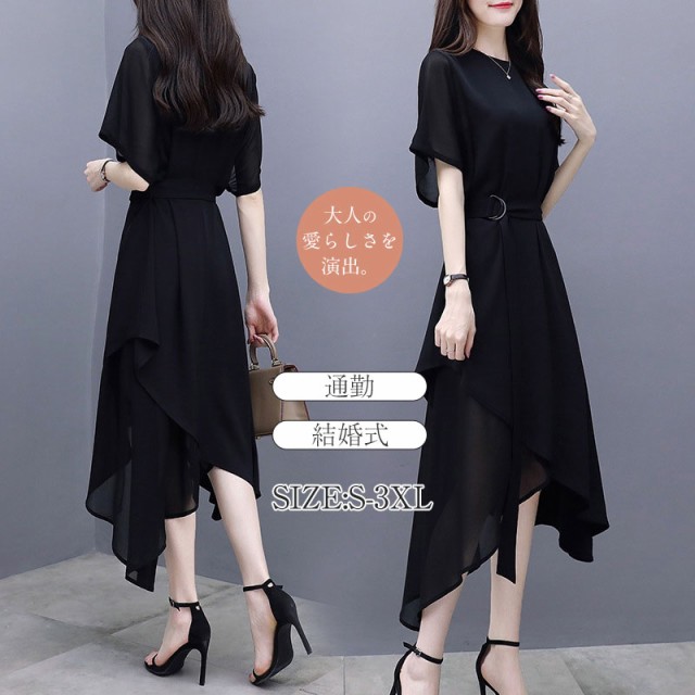 【ポイント5倍!】シフォン ワンピース 安い ドレス パーティー デートワンピ 二次会 食事会 エレガント 婚活 フリル ロング丈 半袖 無地 シンプル