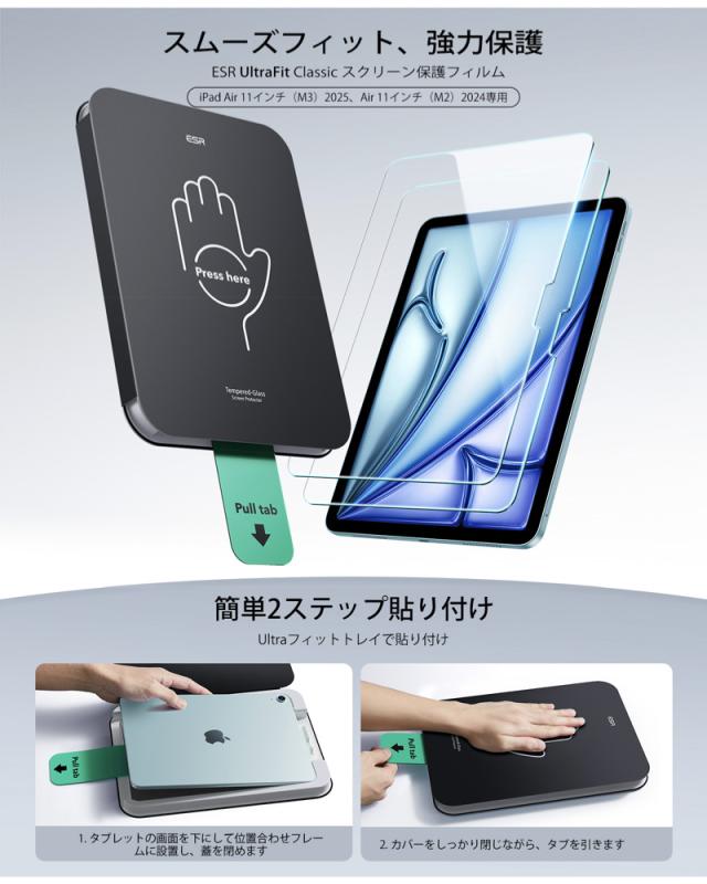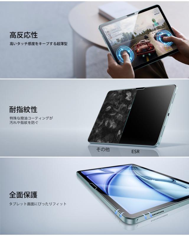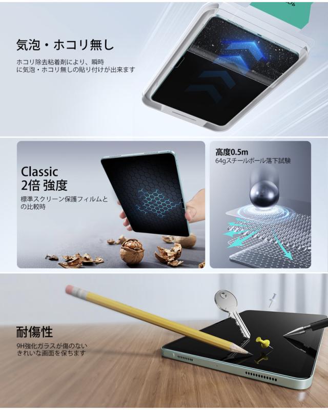 【気泡のない貼り付け】付属しているUltraFitトレイを使用することで、正確な位置決め・ホコリ自動除去で簡単操作で気泡混入しない保護フィルムの貼り付けが行えます。【強力な耐衝撃性】高品質の9H強度ガラスから作られ、落下、キー、ケーブルによる傷やひび割れの損傷から画面を保護し、新品同様の外観を保ちます。【高感度タッチ反応】厚さがわずか0.3mmのためスムーズなゲームプレイ、ビデオ再生、ライティングが可能で、スクリーンをオリジナルの感覚で体験できます。【HD高透過度】超透明でクリアな視覚体験をもたらし、表面コーティングが効果的に画面の汚れや指紋を防ぎ、タッチスクリーンをより滑らかし、クリーリングを行いやすい状態を保ちます。対応機種・iPad Pro 13インチ (M4)(2024)・iPad Pro 11インチ (M4)(2024)・iPad Air 13インチ (M3/M2)(2025/2024)・iPad Air 11インチ (M3/M2)(2025/2024)・iPad (第11/10世代)