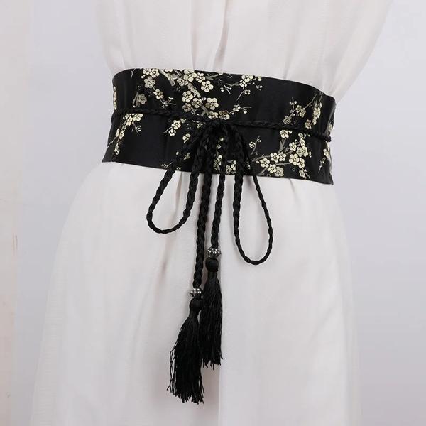 女性のための日本の伝統的な着物,広いベルト,刺繍された花,タッセル,ヴィンテージの花柄,サテンのベルト