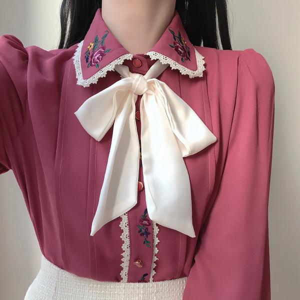 レトロなヴィンテージ刺繍の蝶ネクタイトップ秋の基本的な服エレガントなフォーマルなシングルブレストボタン無地の白いシャツ