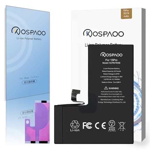 KOSPAOO FOR IPHONE 15PRO バッテリー 交換 標準容量3274MAH 3.879V PSE認証 A3011電池 日本語説明書 対応A2848/A3101/A3102/A3104機種 互換修理用 RECHARGEABLE LI-ION