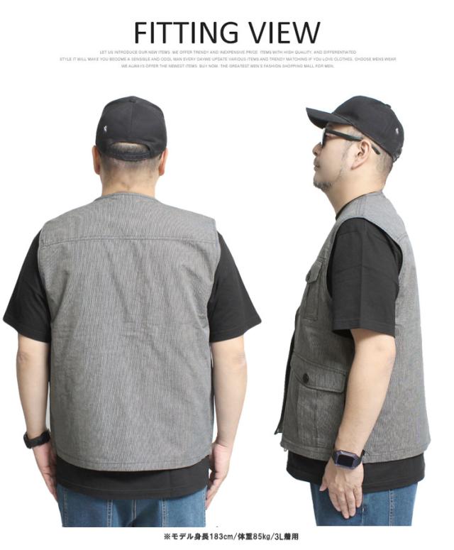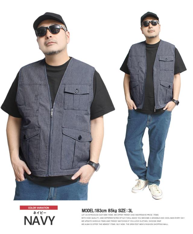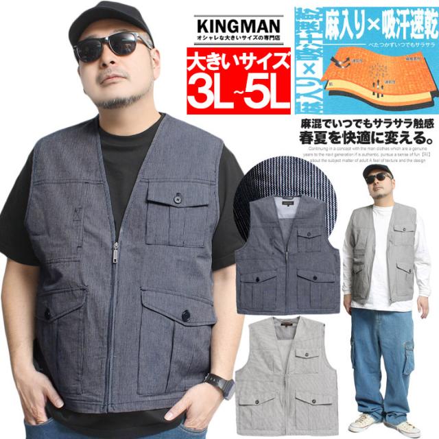 送料無料 リネン ベスト メンズ 大きいサイズ シャンブレー ストライプ 麻入り 吸汗速乾 抗菌性 清涼感 ジップアップ ジレベスト ジャケット トップス シンプル ドライ Vネック 袖なし ノースリーブ メンズベスト キレイめ ワークマン プラス サイズ