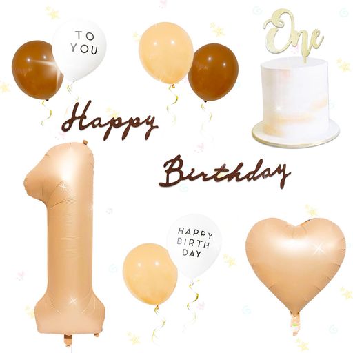 この誕生日の装飾セットは一つの「Happy Birthday」模様の英語の横断幕、一つの茶色の数字「1」の風船、三つのコーヒー色の風船、三つの浅いコーヒー色の風船、一つの「HAPPY BIRTHDAY」の白い風船、一つの「TO YOU」の白い風船、一つのハット形の風船、一つの木材のケーキトッパーを含めます。(サイズは画像をご参考ください。)