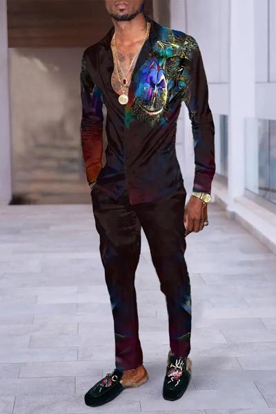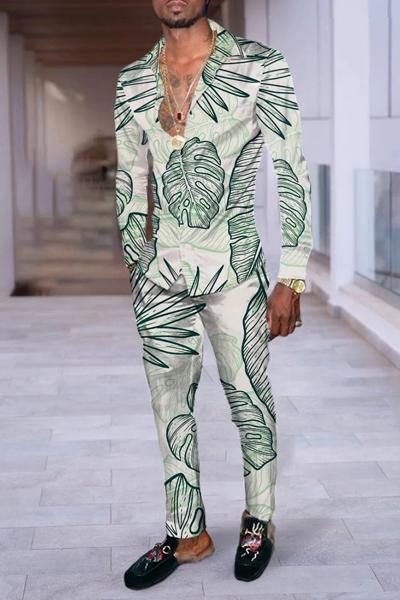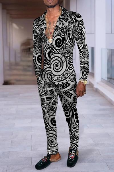メンズ3Dプリントストライプシャツとパンツスーツ、長袖、ラペル、カジュアル、チェックファッション、通気性、2個セット