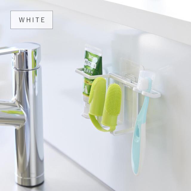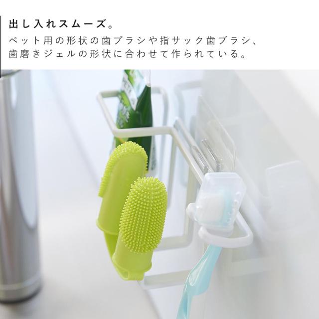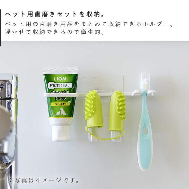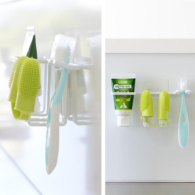 フィルムフックでお好みの位置に簡単取り付け。ペット用の歯ブラシや指サック型歯ブラシ、歯磨きジェルをまとめて収納できるホルダーです。