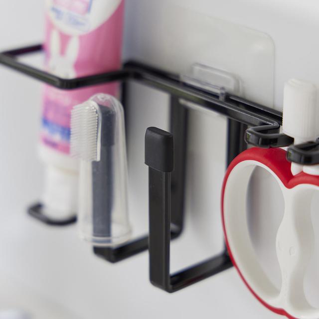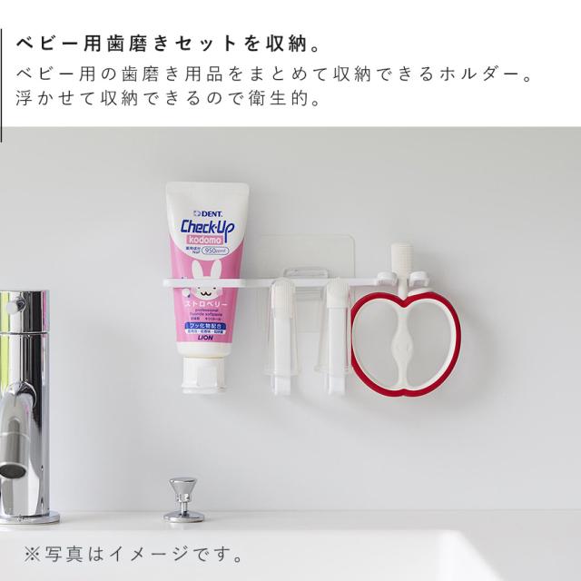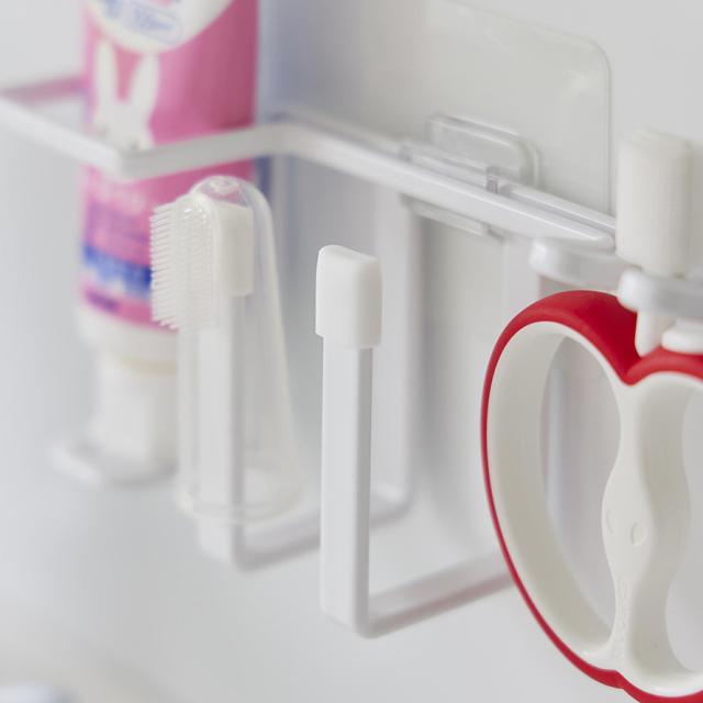 フィルムフックでお好みの位置に簡単取り付け。ベビー用の歯ブラシや指サック型歯ブラシ、歯磨きジェルをまとめて収納できるホルダーです。