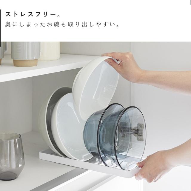 どんぶりやサラダボウルなどおおきめの器が収納でき、片手でも取り出しやすい。