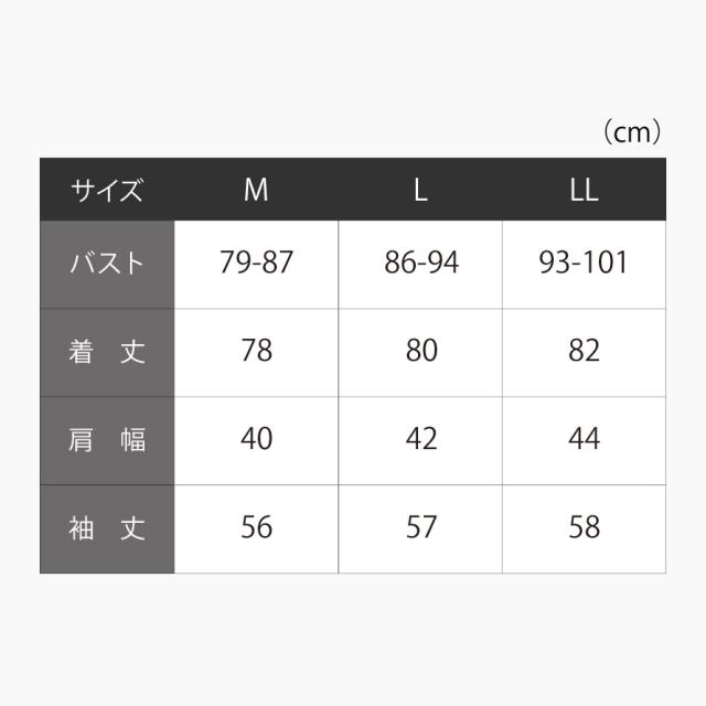 ■サイズ:身長154-162、Mバスト/79-87、着丈78、肩幅40、袖丈56、L/バスト86-94、着丈80、肩幅42、袖丈57、LL/バスト93-101、着丈82、肩幅44、袖丈58cm
