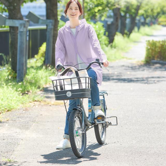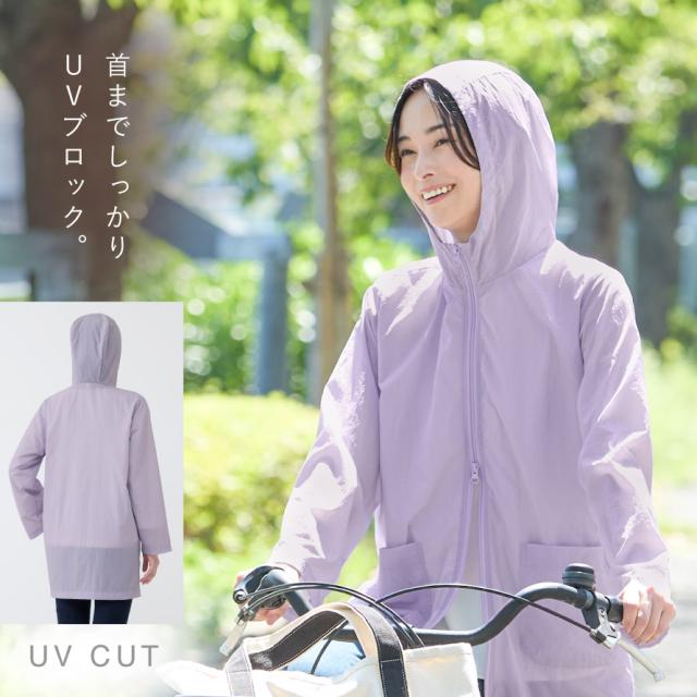 UVカット90%以上。フード付きで、気になる首元や髪の日焼けまでしっかりガード。フードをぴったり閉じると強い風でも脱げにくく、風の日の自転車でも安心です。