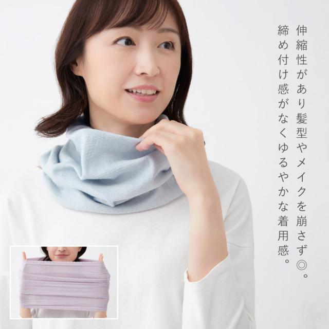 伸縮性があり、かぶるだけの簡単装着。髪型やメイクを崩さず◎。締め付け感がなくゆるやかな着用感です。耳まであげるとマスクとしても使えます。
