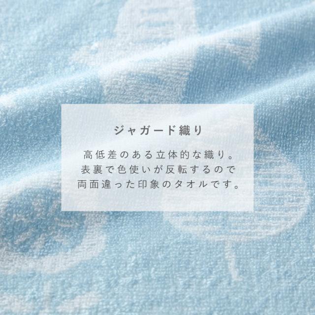 パイル糸に高低差をつけ、絵柄を立体的に表現した「ジャガード織り」。ヘム(短い辺)までパイルにすることで、吸水性と肌あたりのよいタオルに仕上げました。経験豊富なタオル職人が織機で一枚ずつ丁寧に折り上げました。