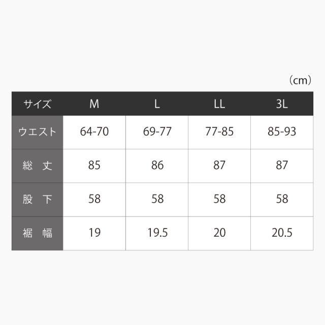 ■サイズ:M/ウエスト64-70、L/ウエスト69-77、LL/ウエスト77-85、3L/ウエスト85-93、股下/58cm