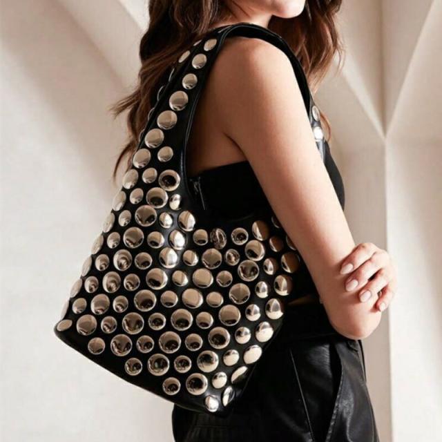 ファッションパンクスタイル 両面フル装飾ラウンド金属スタッズ ニッチ高級バケットバッグ、バイクのレザージャケットや、シック&魅力的な女性、オフィス/通勤、多用途に適しています