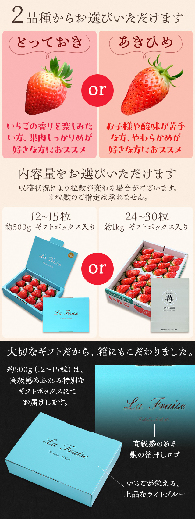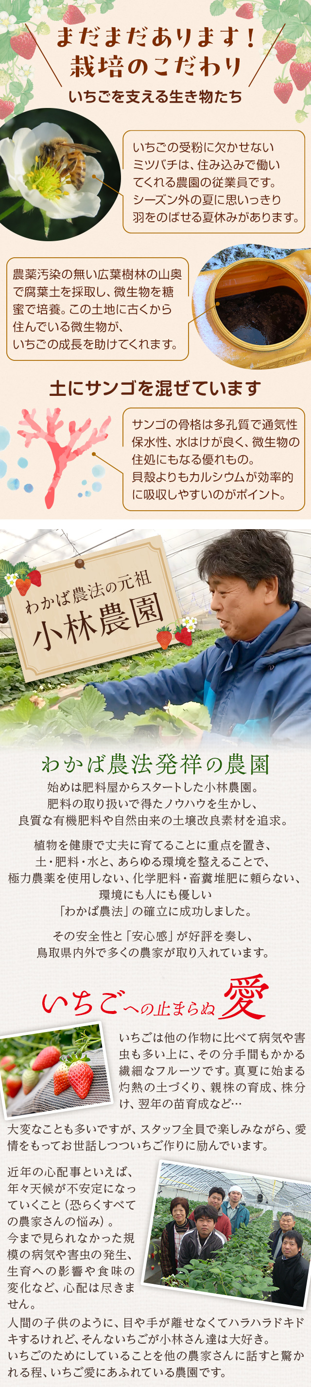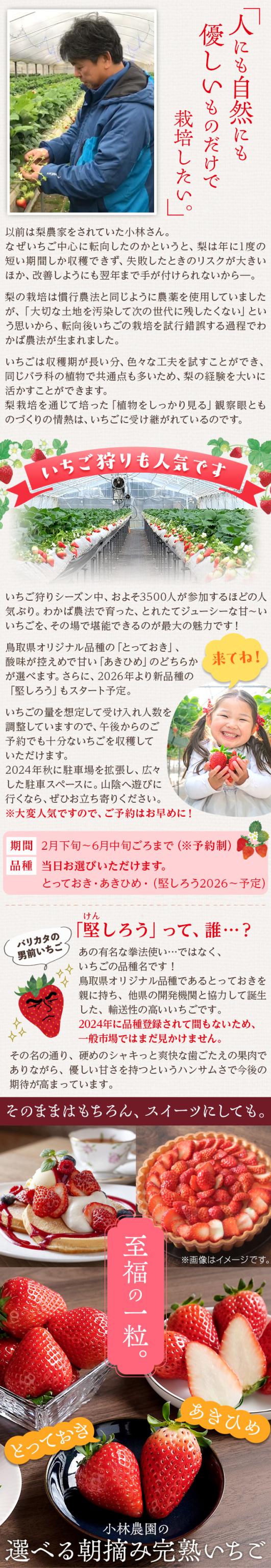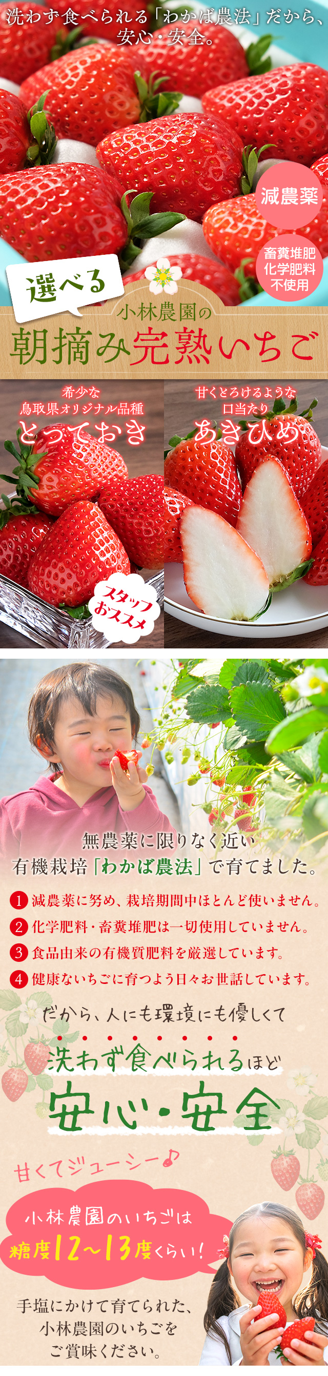 無農薬に限りなく近い有機栽培「わかば農法」で育てた朝摘み完熟いちごを鳥取・小林農園からお届け。贈り物にも最適な専用ギフトBOXをご用意。鳥取県のオリジナル新品種「とっておき」と「あきひめ」の2品種からお選びください。