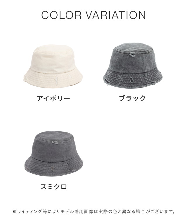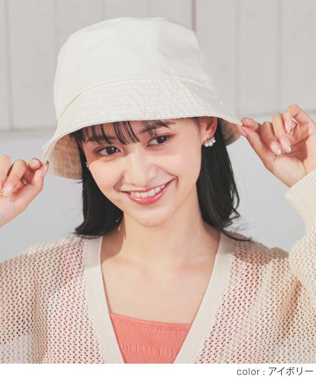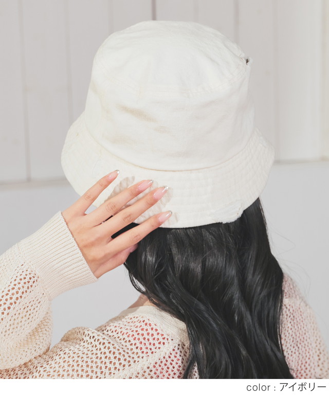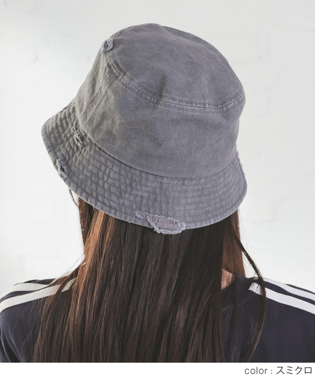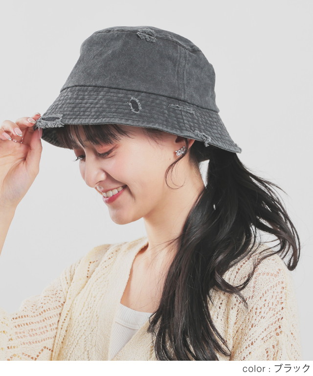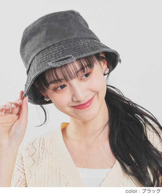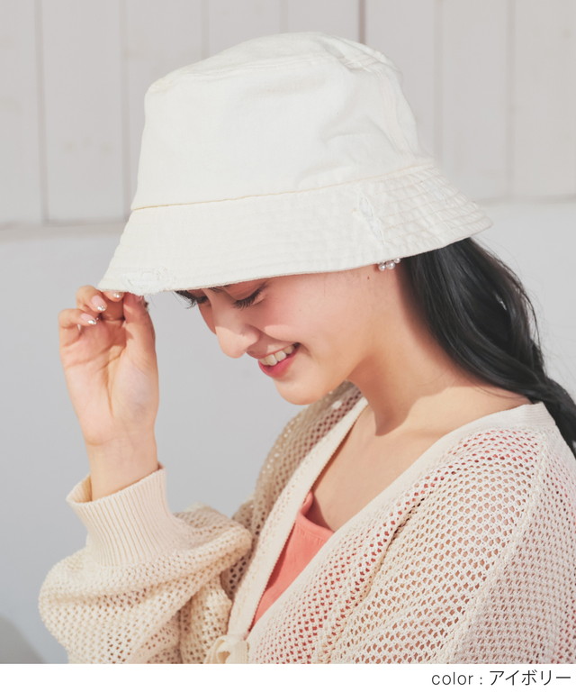 帽子 バケットハット サイズ調整 ダメージ加工 ツイル素材 綿100% ヴィンテージ感 無地 手洗い レディース SALE セール Honeys ハニーズ ダメージバケットハット