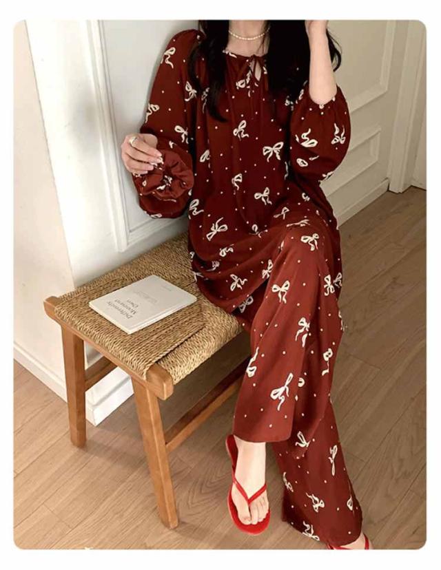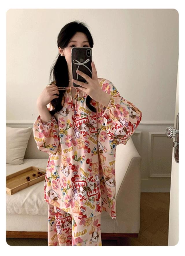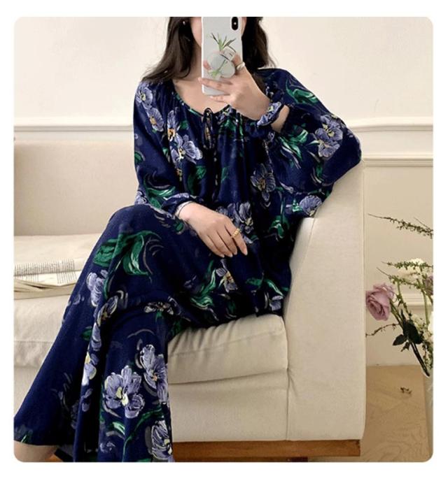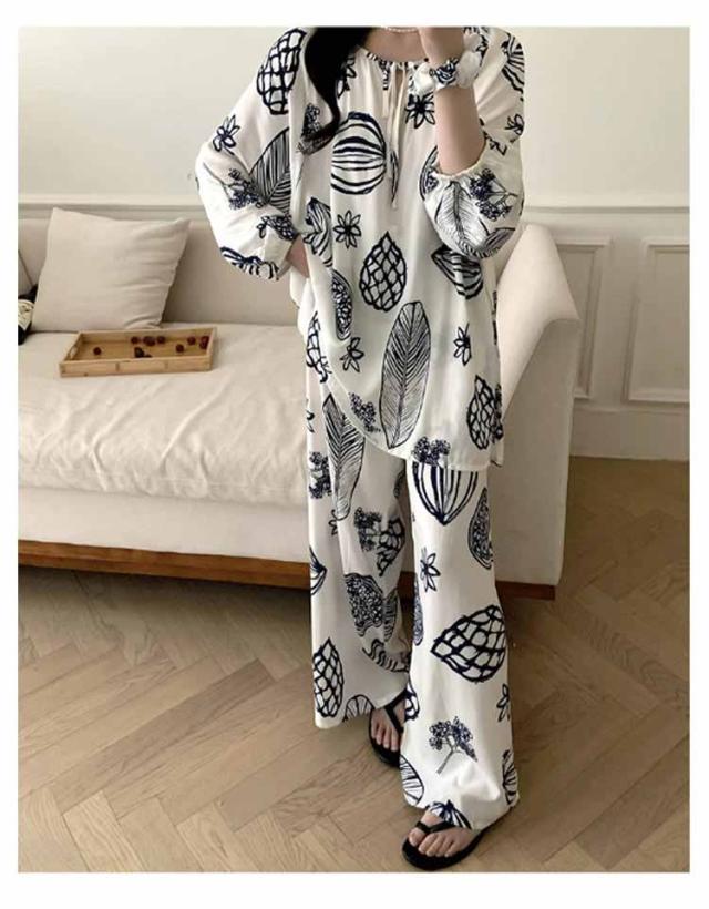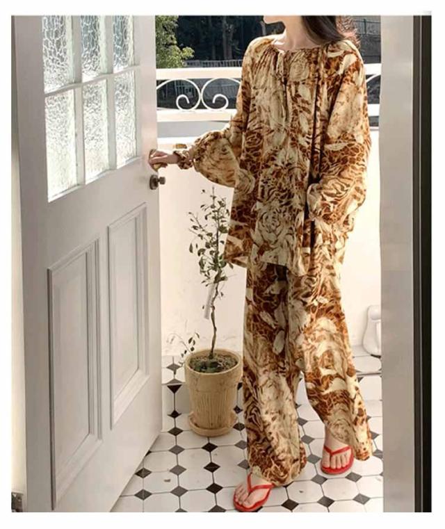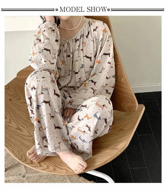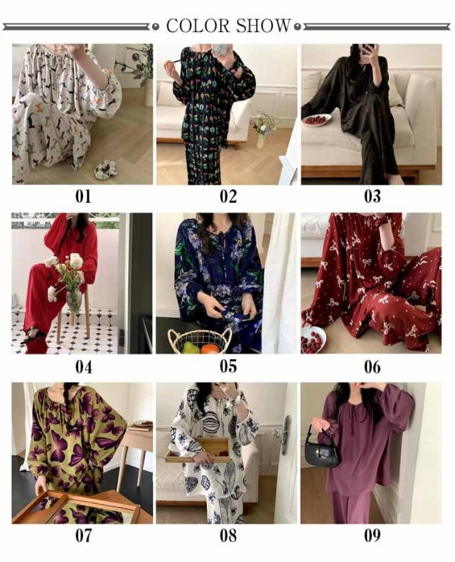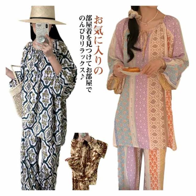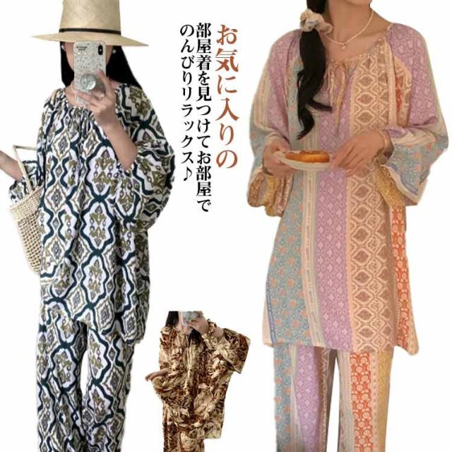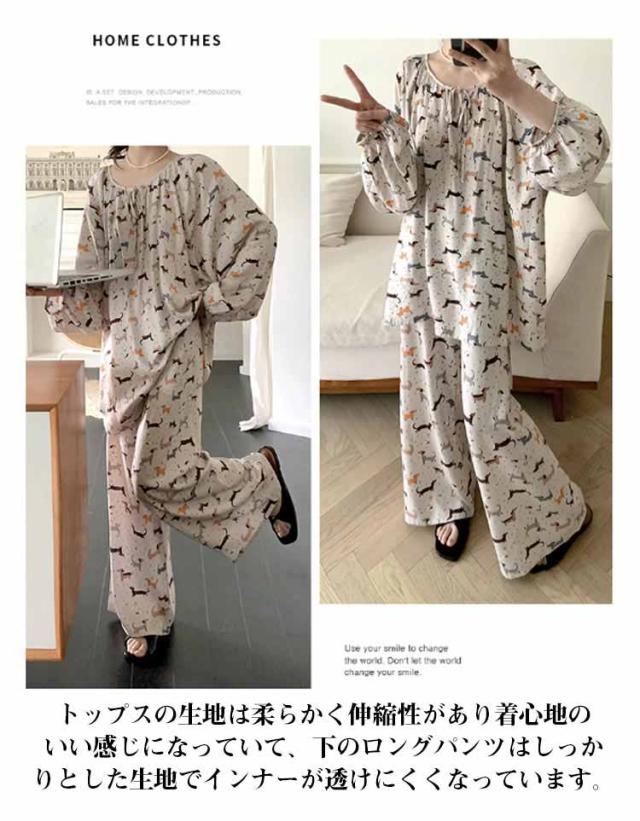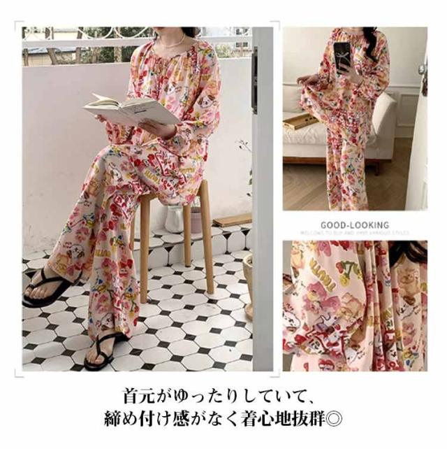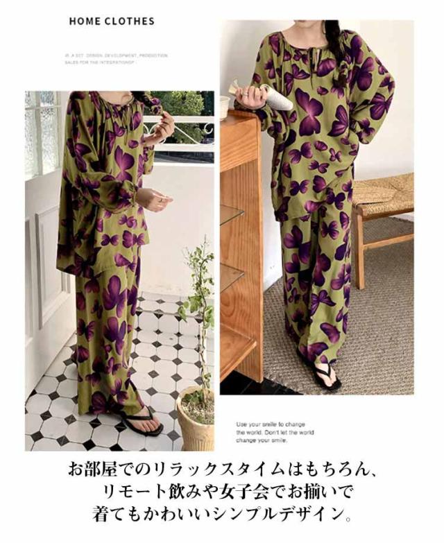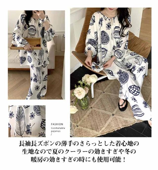 長袖 パジャマ レディース ルームウェア 上下セット Tシャツ ロングパンツ 綿 花 総柄 春夏秋 ゆったり 薄手 大きいサイズ 柔らか かわいい 部屋着 室内着 長ズボン 外出用