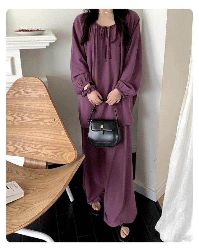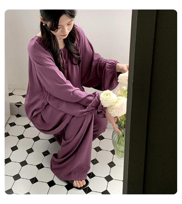| お気に入りの部屋着を見つけてお部屋でのんびりリラックス♪ トップスの生地は柔らかく伸縮性があり着心地のいい感じになっていて、下のロングパンツはしっかりとした生地でインナーが透けにくくなっています。 首元がゆったりしていて、締め付け感がなく着心地抜群◎ 長袖長ズボンの薄手のさらっとした着心地の生地なので夏のクーラーの効きすぎや冬の暖房の効きすぎの時にも使用可能! お部屋でのリラックスタイムはもちろん、リモート飲みや女子会でお揃いで着てもかわいいシンプルデザイン。 | |