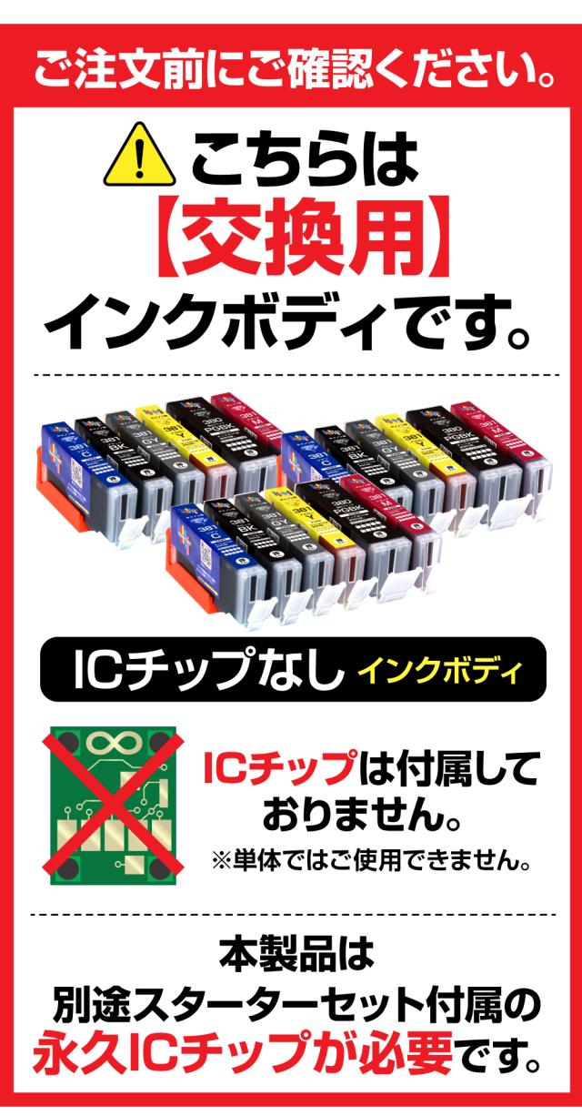 | 繰り返し使える永久ICチップ専用の交換用互換インクカートリッジです。 別途永久ICチップ付きスターターセットが必要になります。 本製品だけでは、ご使用になれませんので予めご了承ください。 |