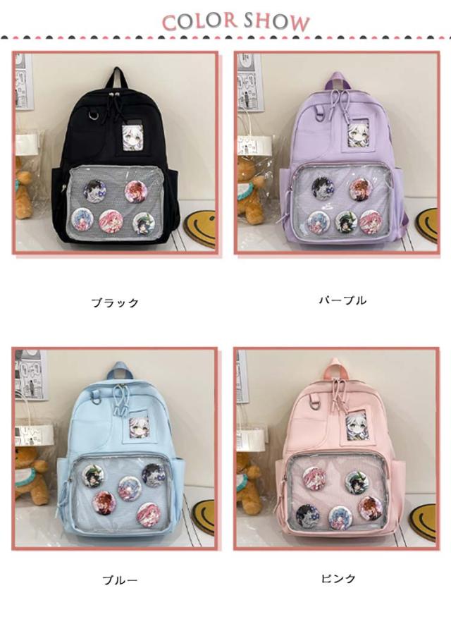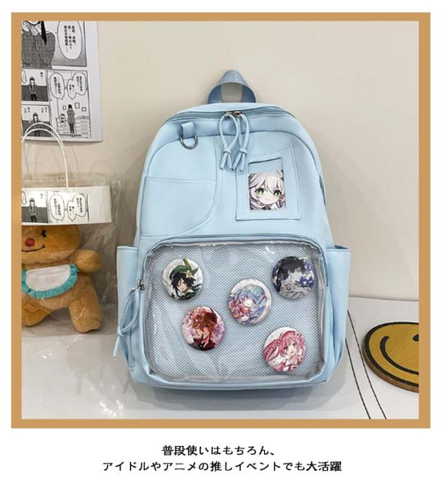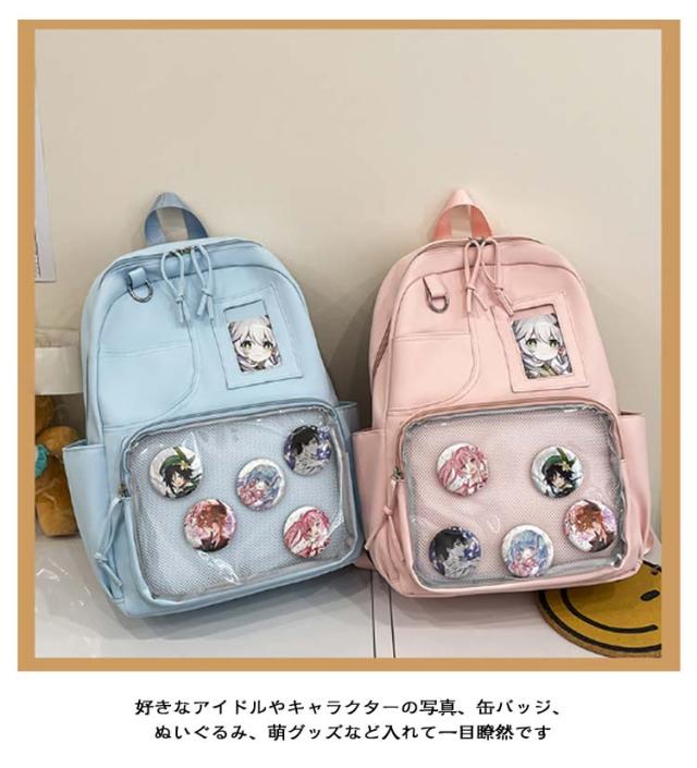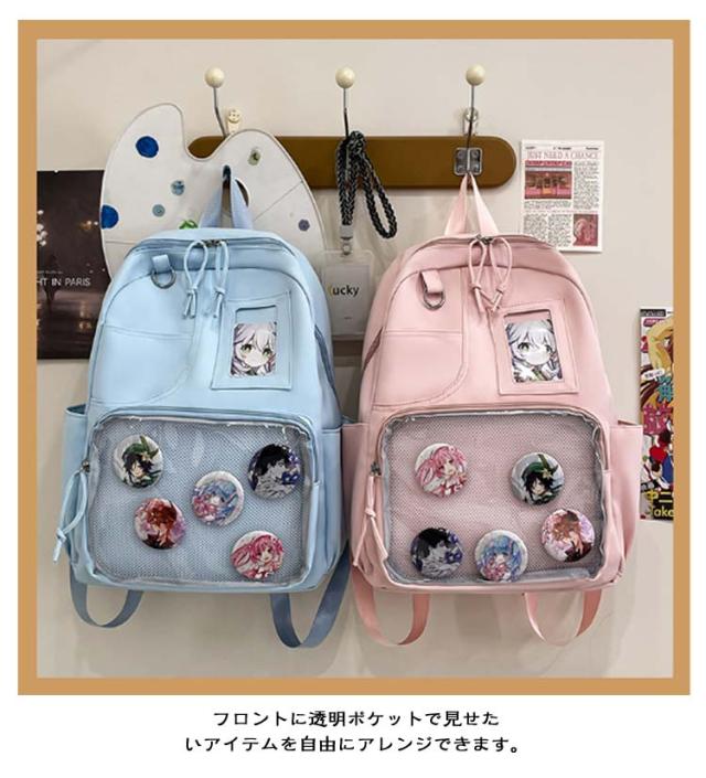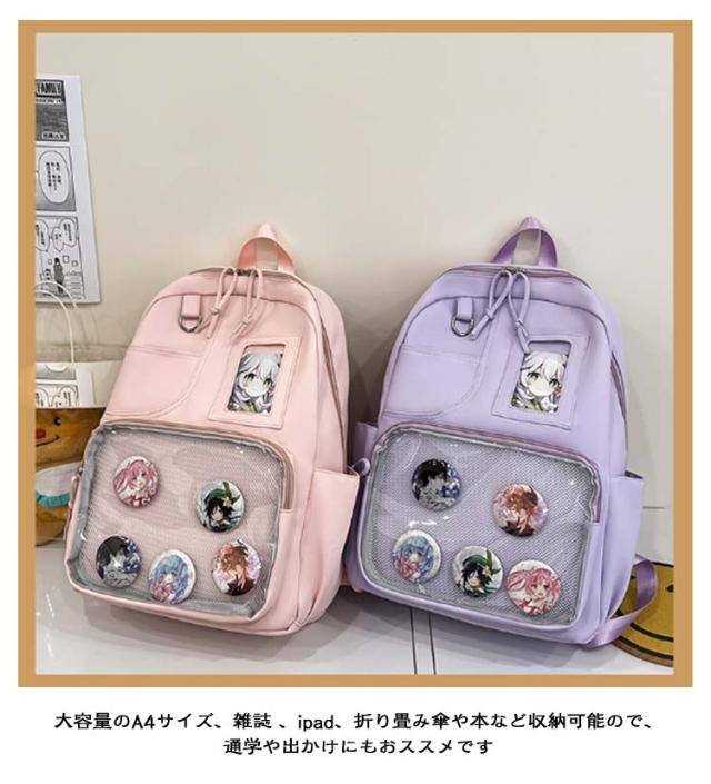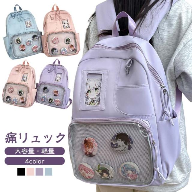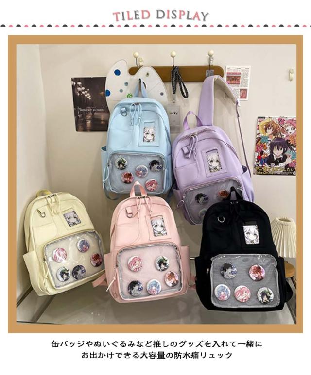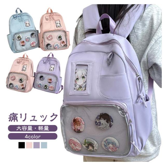 | 【痛リュック】【大容量・軽量】【4color】 缶バッジやぬいぐるみなど推しのグッズを入れて一緒にお出かけできる大容量の防水痛リュック♪ フロントに透明ポケットで見せたいアイテムを自由にアレンジできます。 好きなアイドルやキャラクターの写真、缶バッジ、ぬいぐるみ、萌グッズなど入れて一目瞭然です♪ 大容量のA4サイズ、雑誌 、ipad、折り畳み傘や本など収納可能ので、通学や出かけにもおススメです♪ 普段使いはもちろん、アイドルやアニメの推しイベントでも大活躍 | |