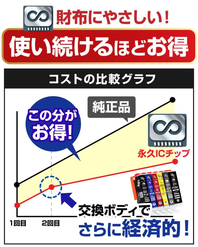 繰り返し使える永久ICチップ付きの互換インクカートリッジです。 インクが無くなった際は、インクボディのみ(ICチップなし)を追加でご購入いただき、 永久ICチップを付け替えることで、ご使用いただけます。