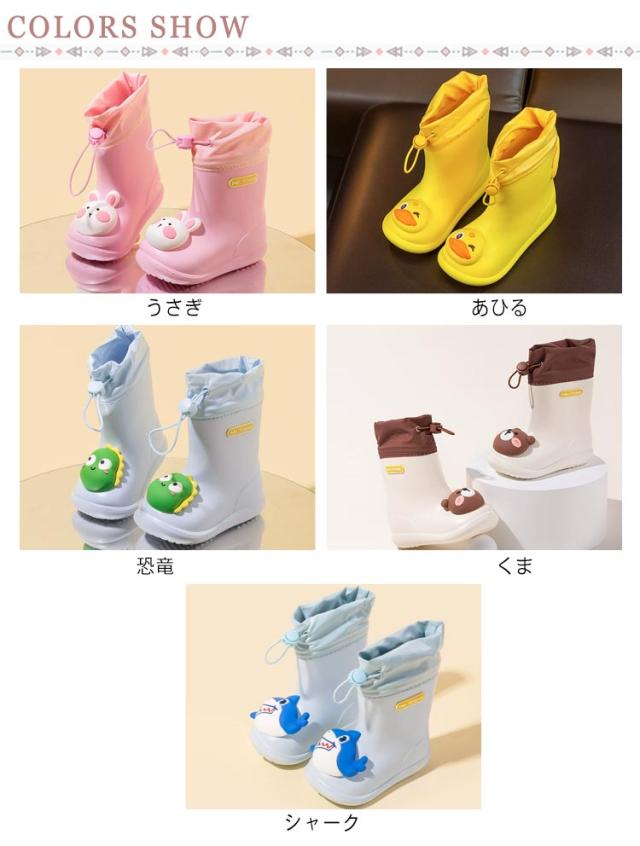 | 動物柄 かわいい キッズレインブーツ 14-22cm ドローコードで履きロをしぽることができるのでフィット感を調節可能です ぐにゃっと曲がる柔らかで軽いPVC素材を使用疲れにくく、しゃがんでも足首が楽ちんです 雨道でも安心♪縫い目がないので防水性 濡れた床も滑りにくい、クリップ力が強い靴底 | |