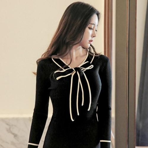 ラウンドネック配色ボウタイミニ丈ニットワンピース(キャバドレス・CABARETDRESS)。