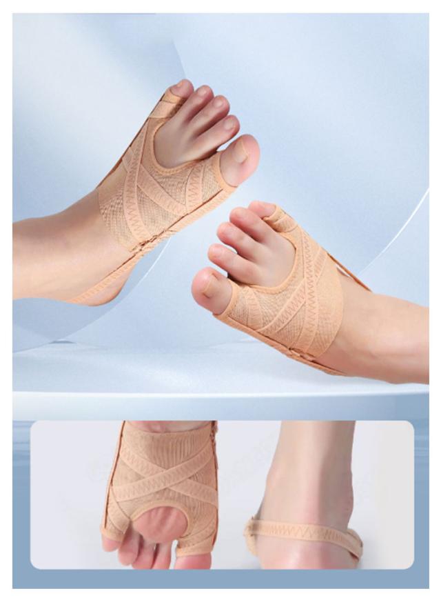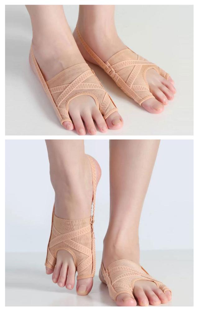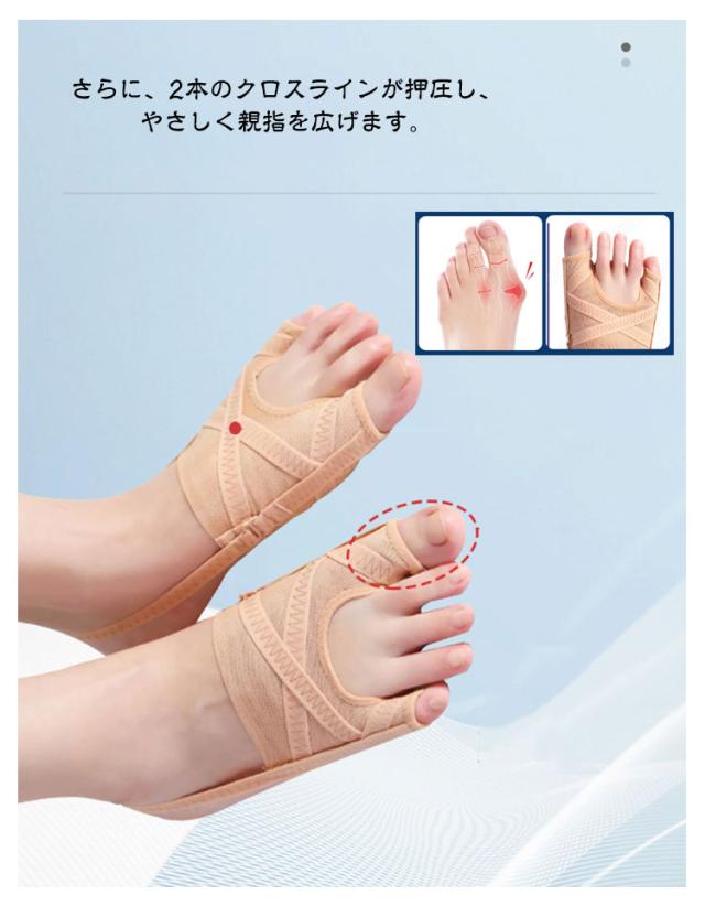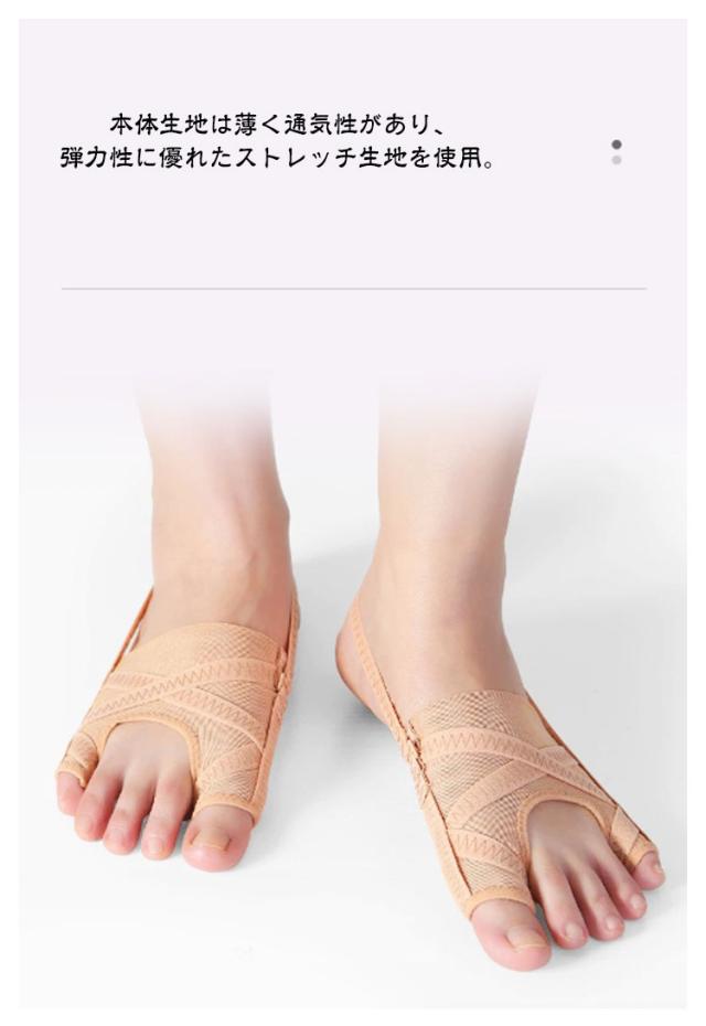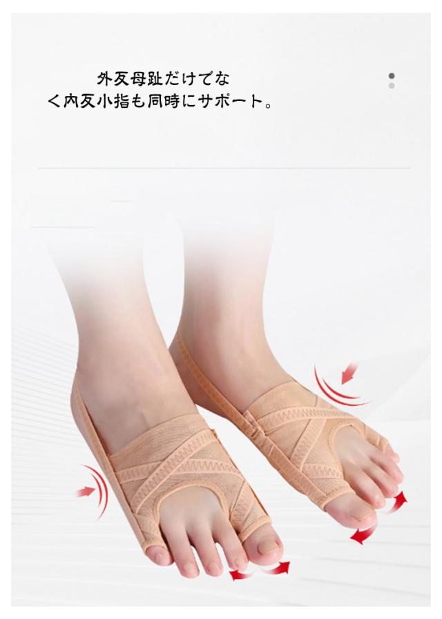 | 外反母趾・内反小趾サポーター 肌色(2枚セット) サイドのバンドが指を引っ張ることで、履くと自然と親指と小指が開きます。 さらに、2本のクロスラインが押圧し、やさしく親指を広げます。 本体生地は薄く通気性があり、弾力性に優れたストレッチ生地を使用。 外反母趾だけでなく内反小指も同時にサポート。 | |