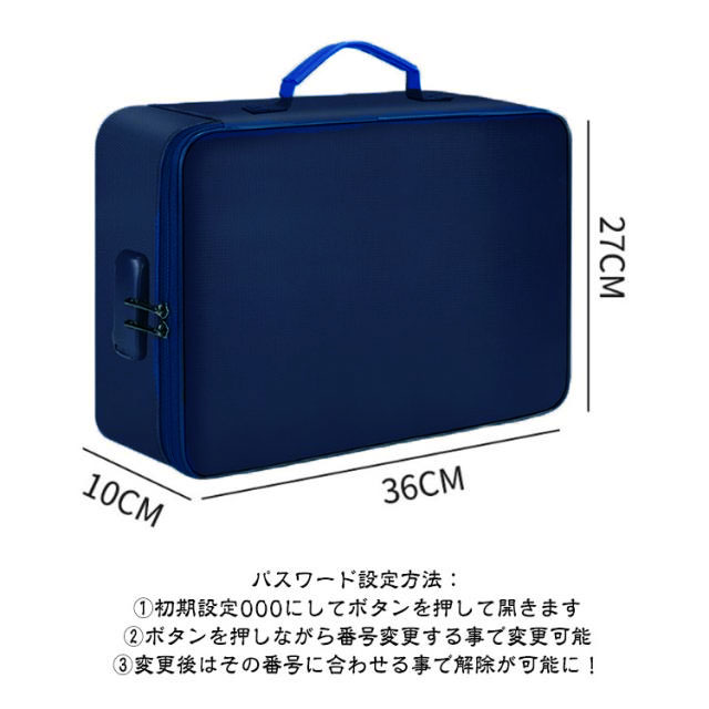 | 折り畳み 耐火収納バッグ。貴重品や重要書類を火事や災害から守る耐火バッグ。 グラスファイバー製なので炎に強く頑丈です。 大切な書類や貴重品の管理に。 プライバシーを守るダイヤルロック付き。 持ち手付きで持ち運びもラクラク! パスワード設定方法:?初期設定000にしてボタンを押して開きます ?ボタンを押しながら番号変更する事で変更可能 ?変更後はその番号に合わせる事で解除が可能に! | |