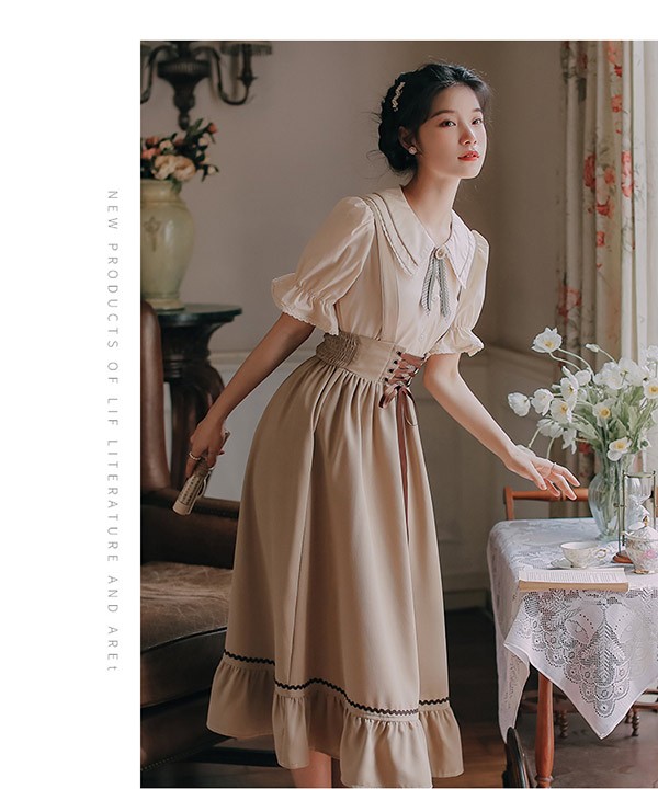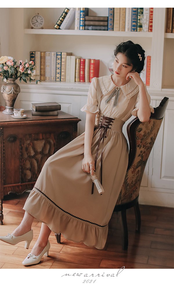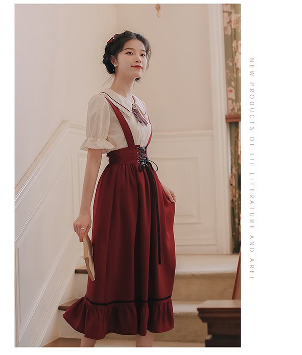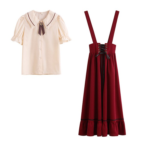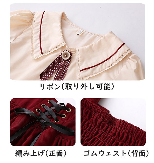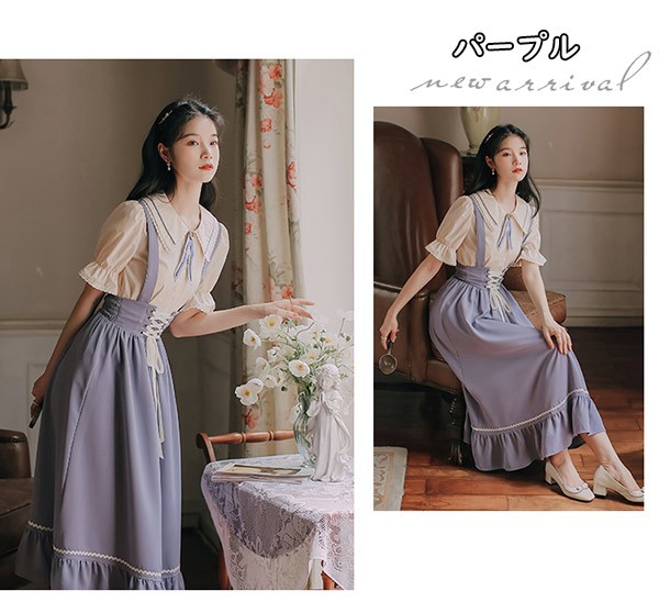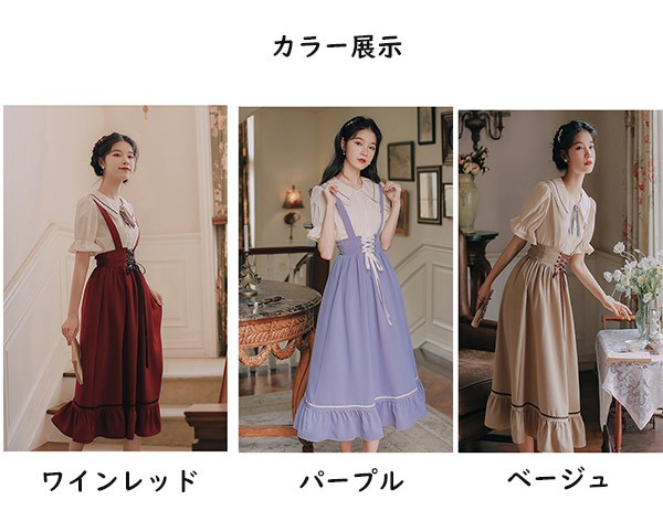 洋服 ロリータ ブラウス 3点セット 3カラー 半袖 サスペンダースカート ロングスカート Aライン パワーショルダー キャンディスリーブ リボン レディース ロング 可愛い lolita 日常可 春 秋 dd041m5