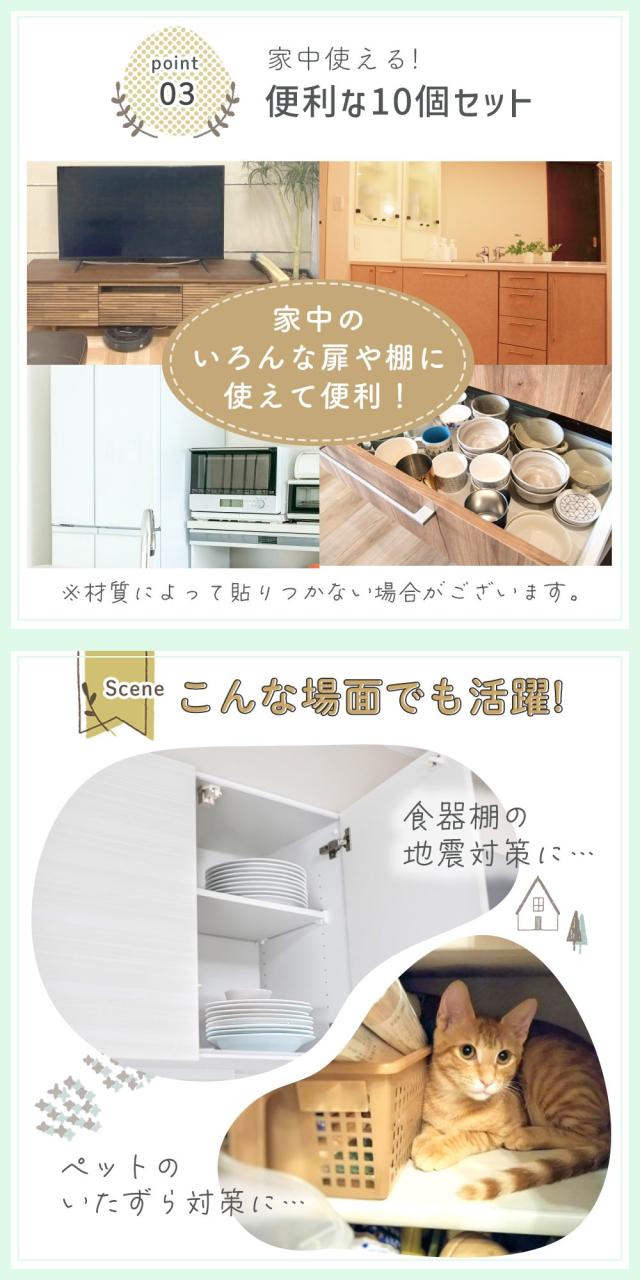 チャイルドロック/ドアストッパー/ベビーガード/ドアロック/安全/いたずら防止/セーフティーグッズ/地震/防災対策/グッズ/怪我防止/後付け/貼るだけ/粘着式/穴開け不要/簡単取付/指はさみ/子供/赤ちゃん/ペット/ベビー用品/プレゼント/おしゃれ/10個セット/引き戸/引き出し/冷蔵庫/ドア/観音扉/観音開き/タンス/棚/戸口/扉/戸棚/開き戸/クローゼット/窓/引き出しロック/引き戸ロック/扉ロック/キャビネットロック/安全ロック/ねこ/猫/TN-BBGD