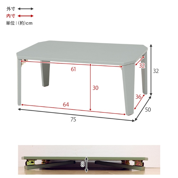 くすみカラーやモノトーンカラーが選べ、コンパクトサイズでワンルームや1人部屋にぴったり。 省スペース収納可能な折れ脚タイプ。 ■カラー ブルーグレー ■サイズ 幅75cm×奥行50cm×高さ32cm 折りたたんだ状態の高さ:8cm ■素材 主材:繊維板 ■生産地 ベトナム ■備考 折りたたみ式 ■組立 完成品 ※お客様組立て品につきましては、組み立て後に不良の連絡をされても対応ができません。組み立て前にパーツに不良・傷等がないか、必ずご確認下さいますようよろしくお願い申し上げます。 ※記載は商品仕様の一部です。仕様説明不足等の理由での返品はできません。特に適合等は必ずご確認ください。