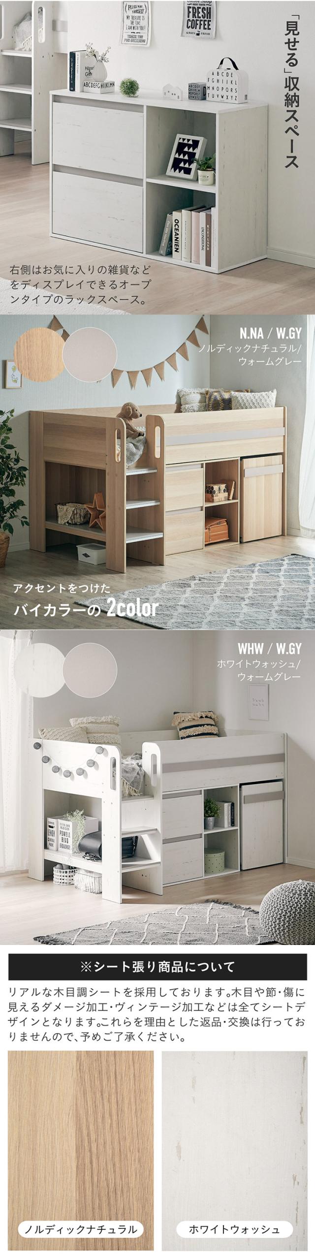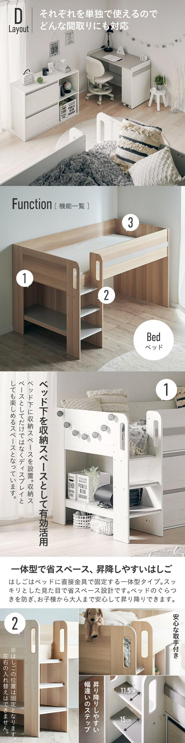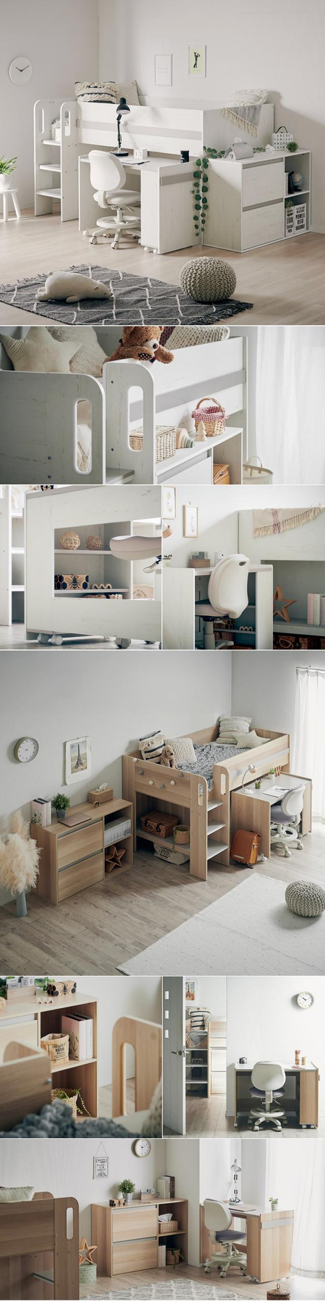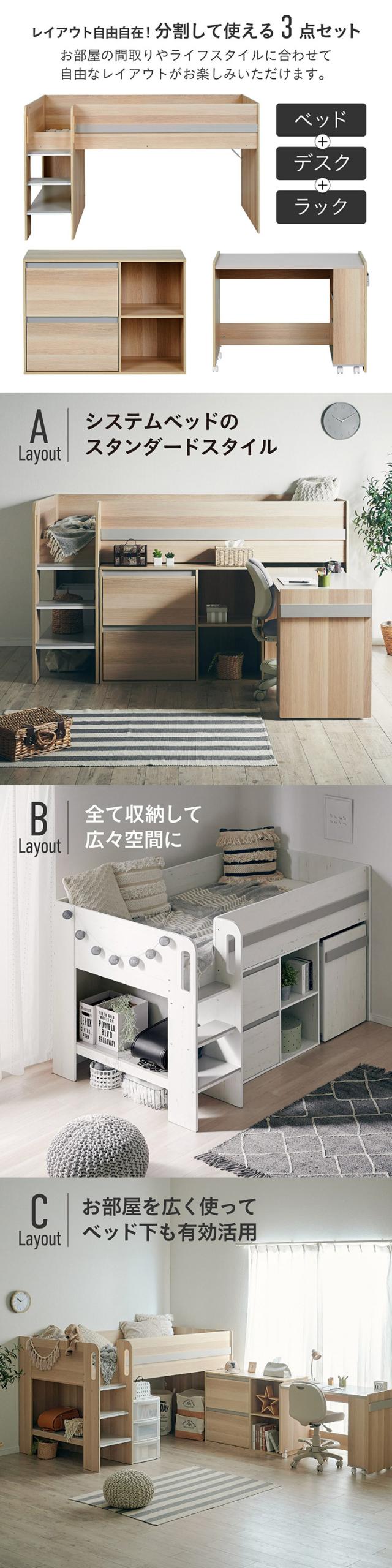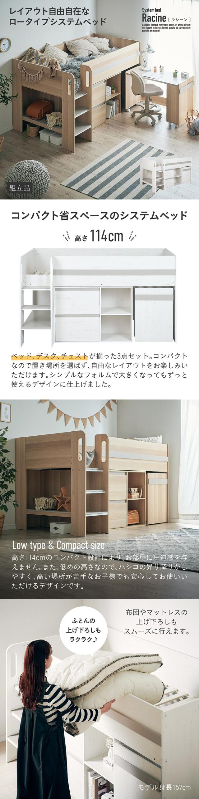 ロフトベッド システムベッド 高さ72cm デスク チェスト 3点セット Racine(ラシーン) 2色対応 ロフトベット システムベット ロータイプ おしゃれ 学習デスク 収納棚 キャスター付き シングルベッド