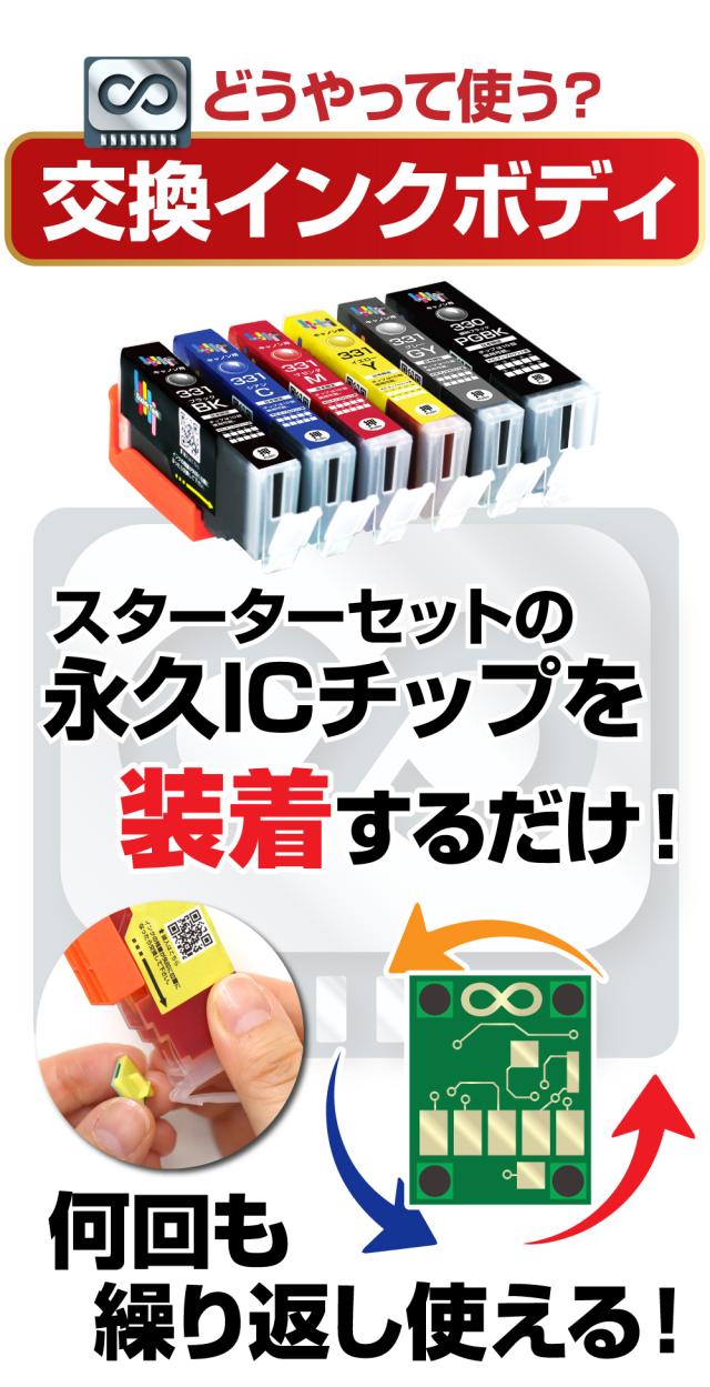 商品の特性:繰り返し使える永久ICチップ付きの互換インクカートリッジです。 インクが無くなった際は、インクボディのみ(ICチップなし)を追加でご購入いただき、 永久ICチップを付け替えることで、ご使用いただけます。