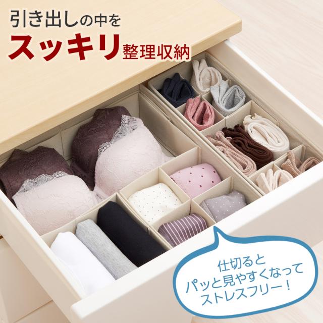 引き出しの中をスッキリ整理収納引出しの中で混沌としがちな靴下や下着などの衣類小物。一つずつ仕切ることで視認性がよくなり、時短・ストレスフリーに。
