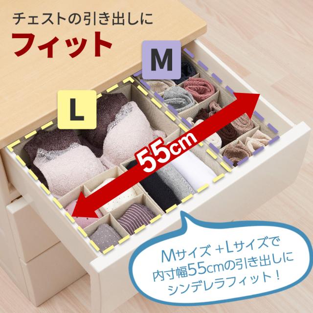 チェストの引き出しにピッタリMサイズ+Lサイズ(別売)の組み合わせで、幅55cmのクローゼット収納ケースの引出しにぴったり入ります。